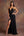 Robe longue formelle en satin noir à épaules dénudées avec volants