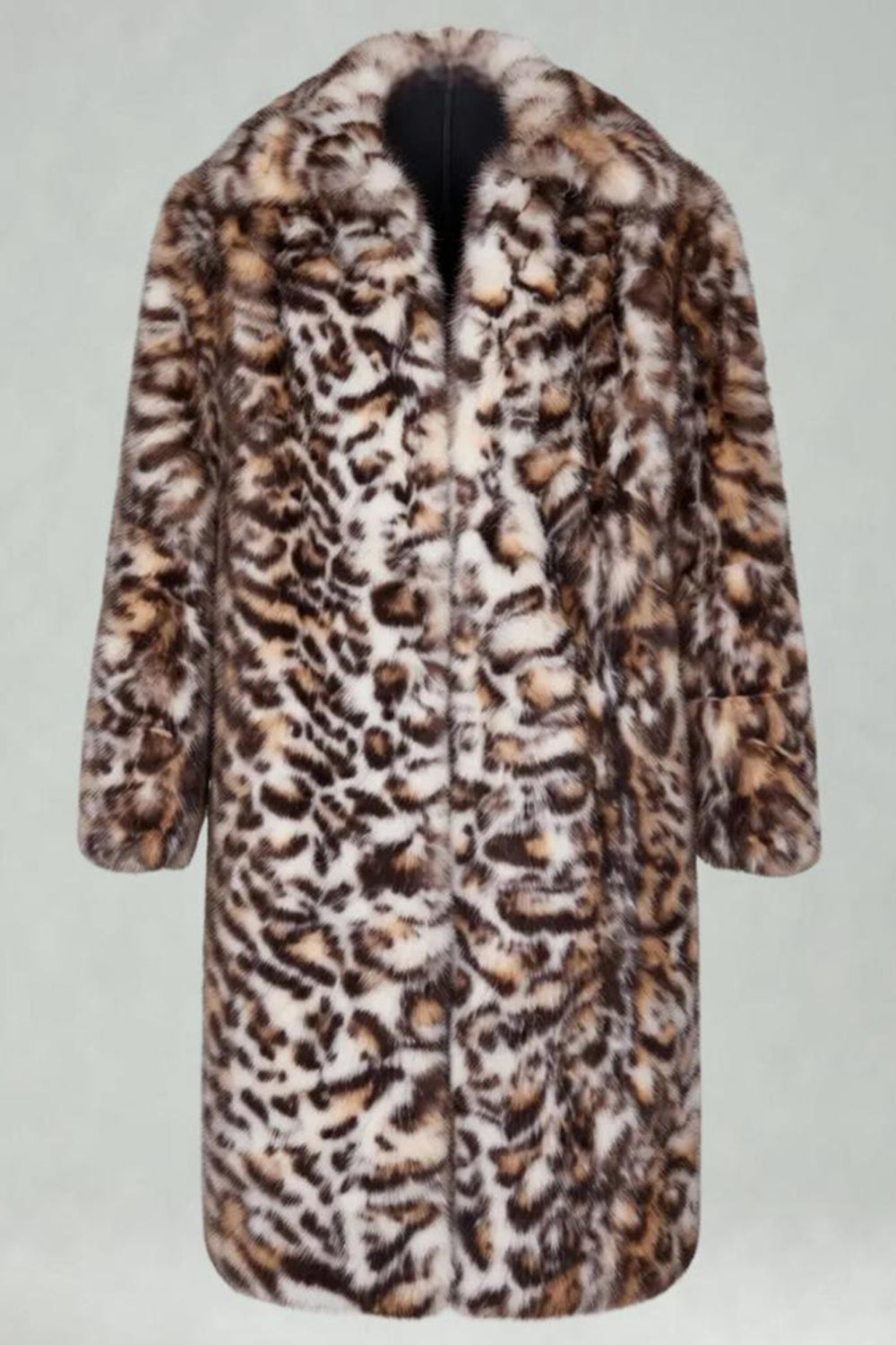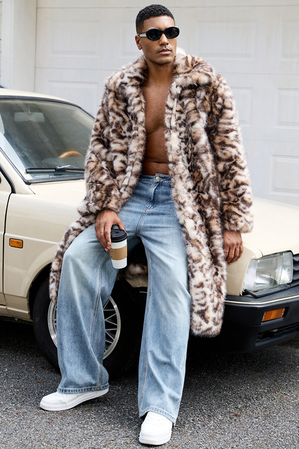 Manteau d’homme long ouvert devant fausse fourrure de léopard brun