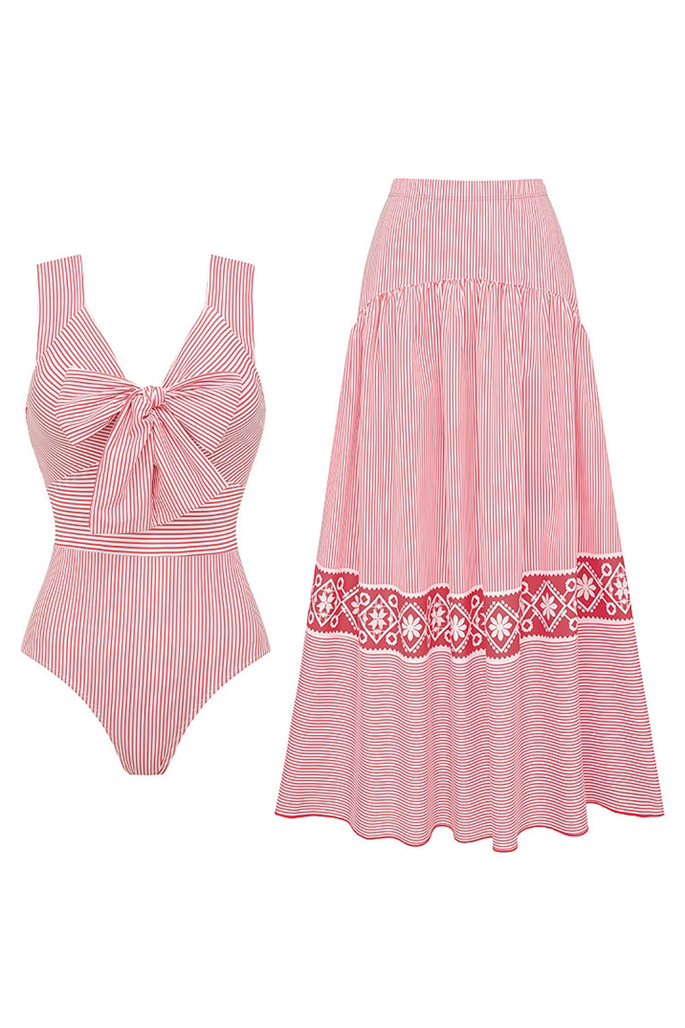 Ensemble de maillots de bain 2 pièces en nœud nœud à rayures rouges avec robe de plage