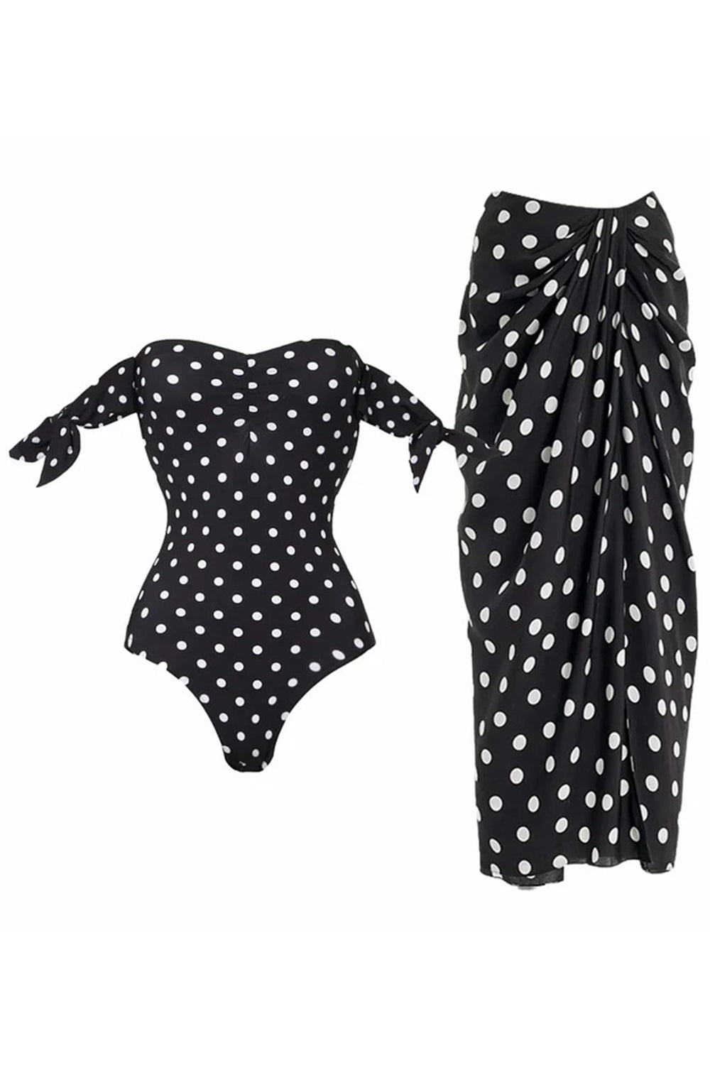 Maillot de bain noir à pois blancs à deux pièces dénudé avec jupe de couverture