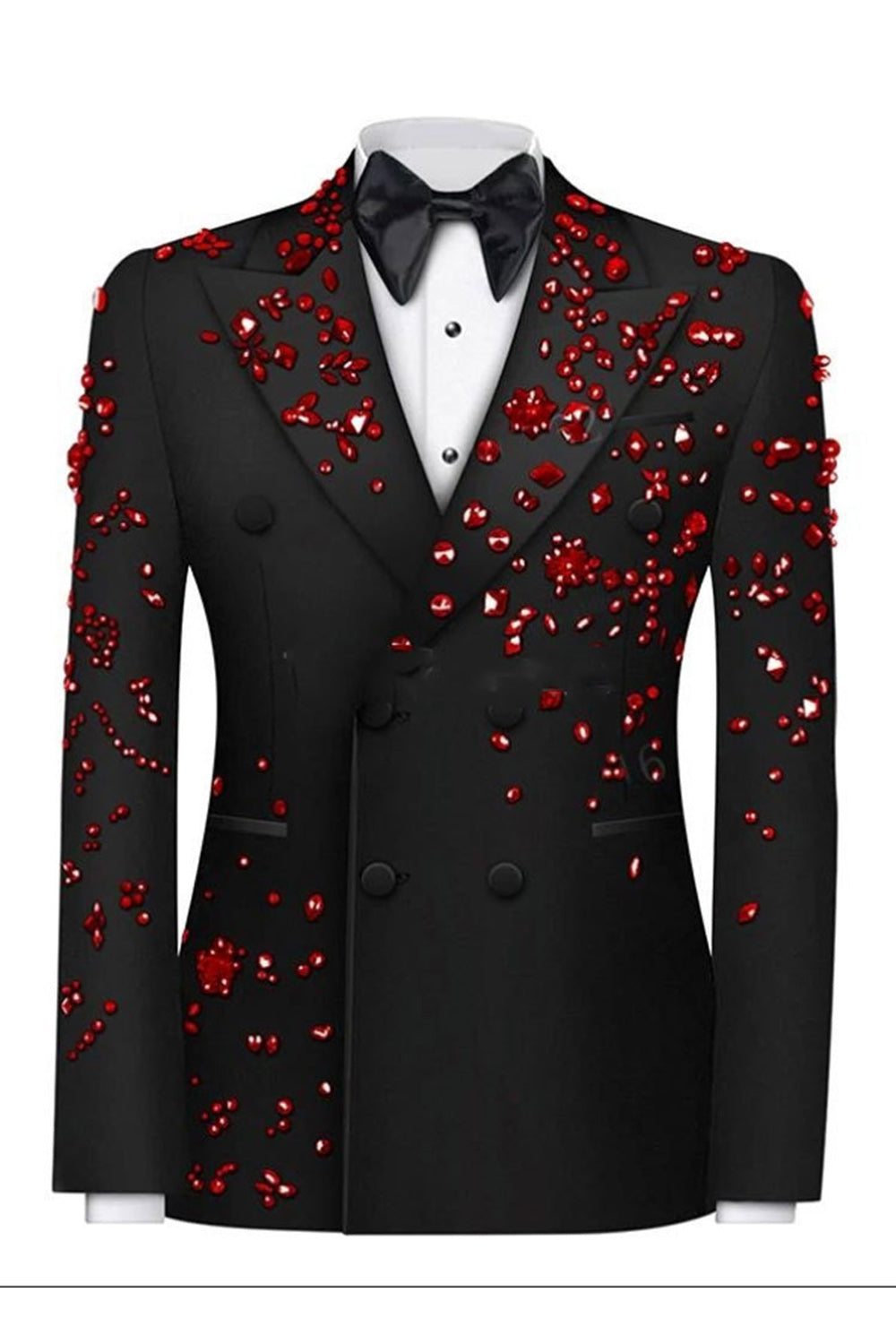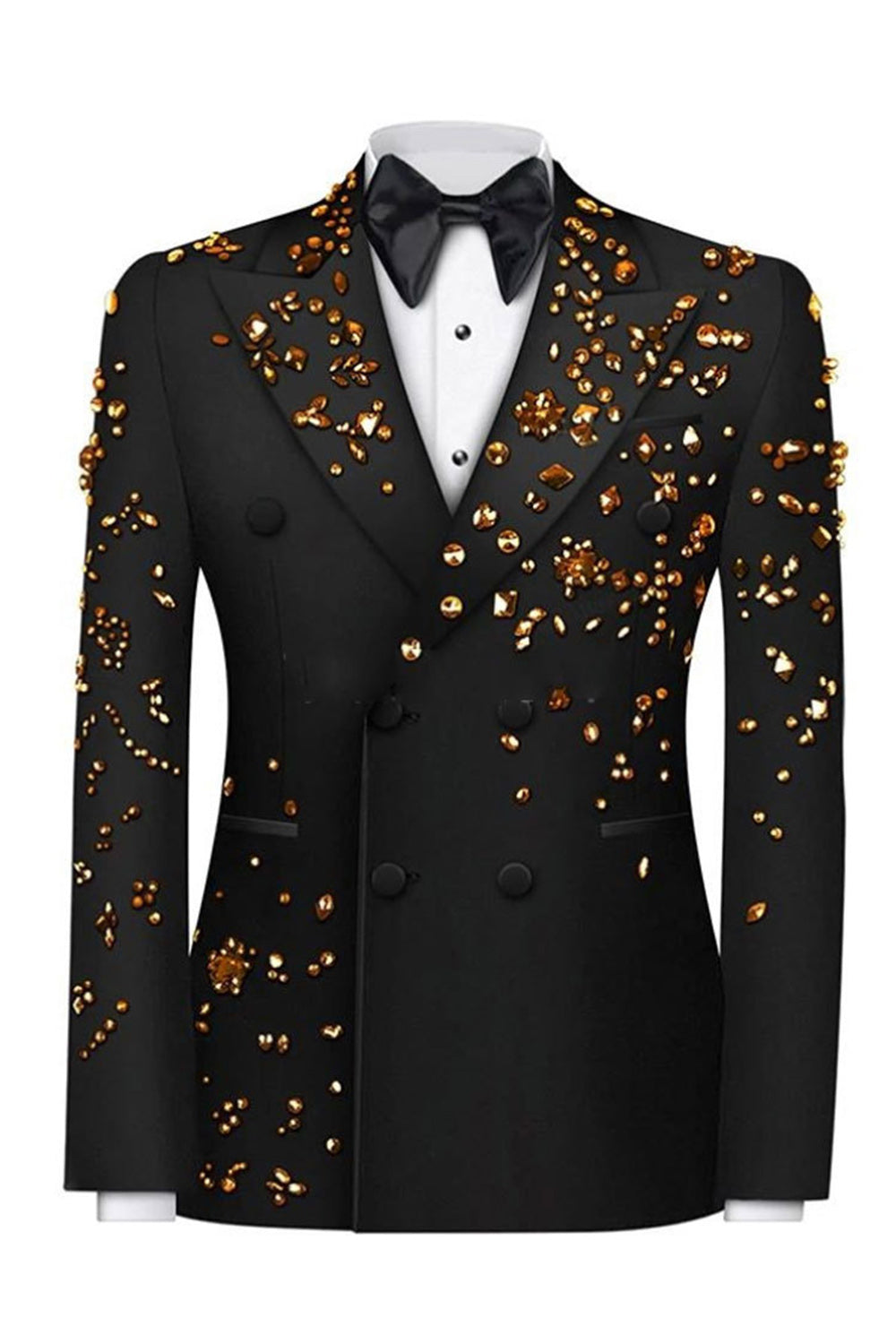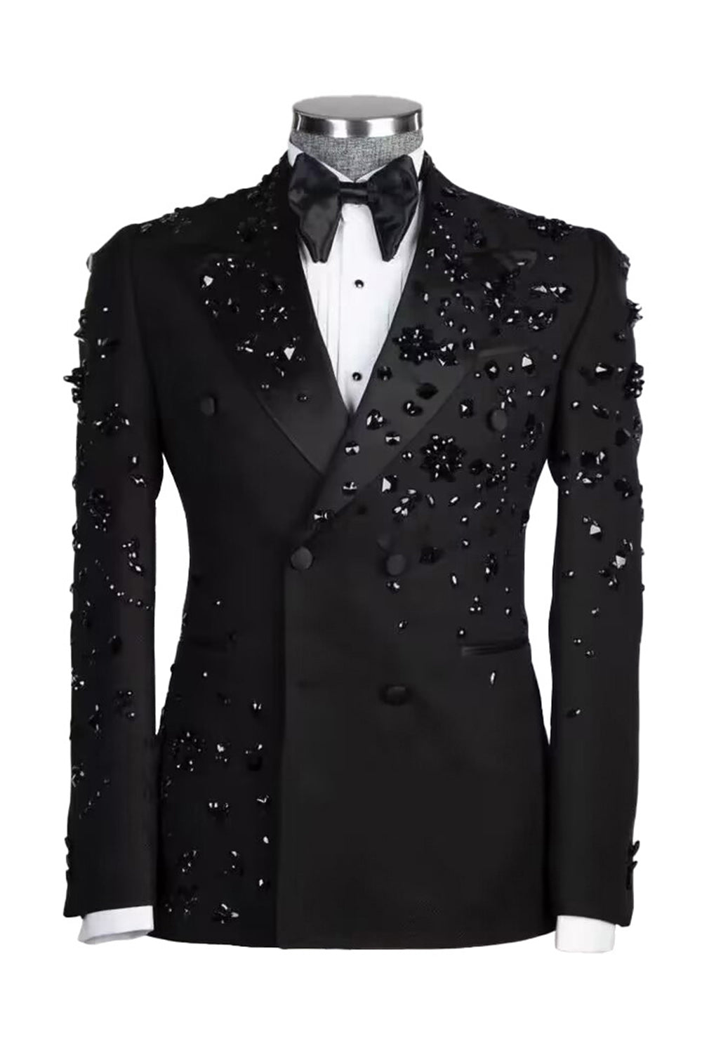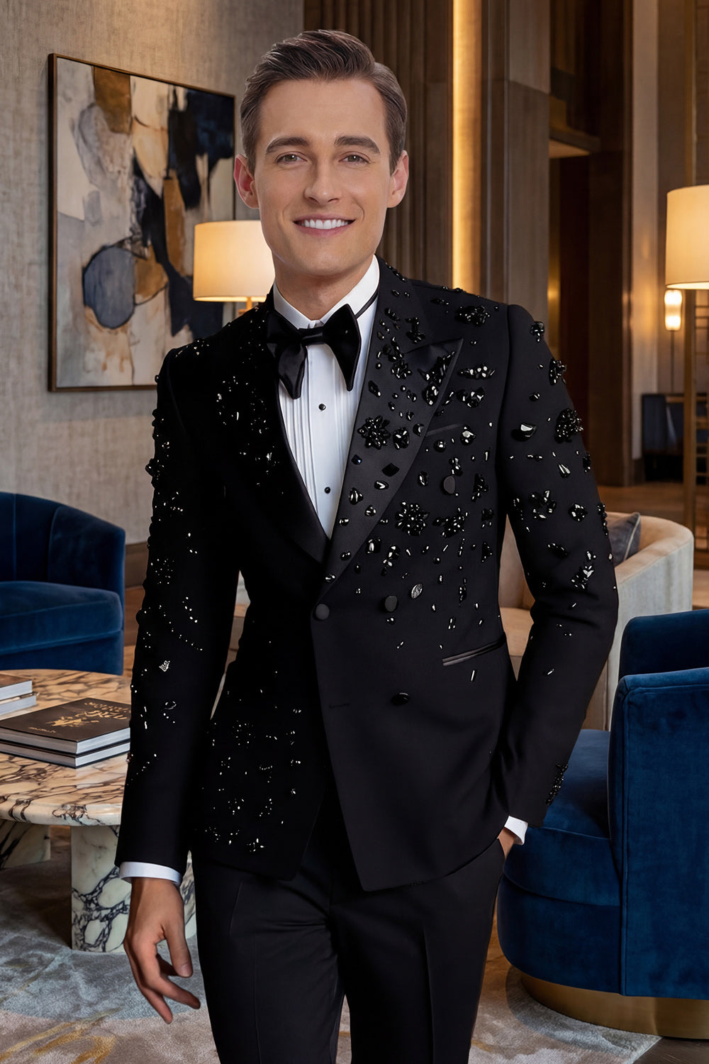 Costumes de bal de bal en deux pièces à revers pointus noirs à perles étincelantes