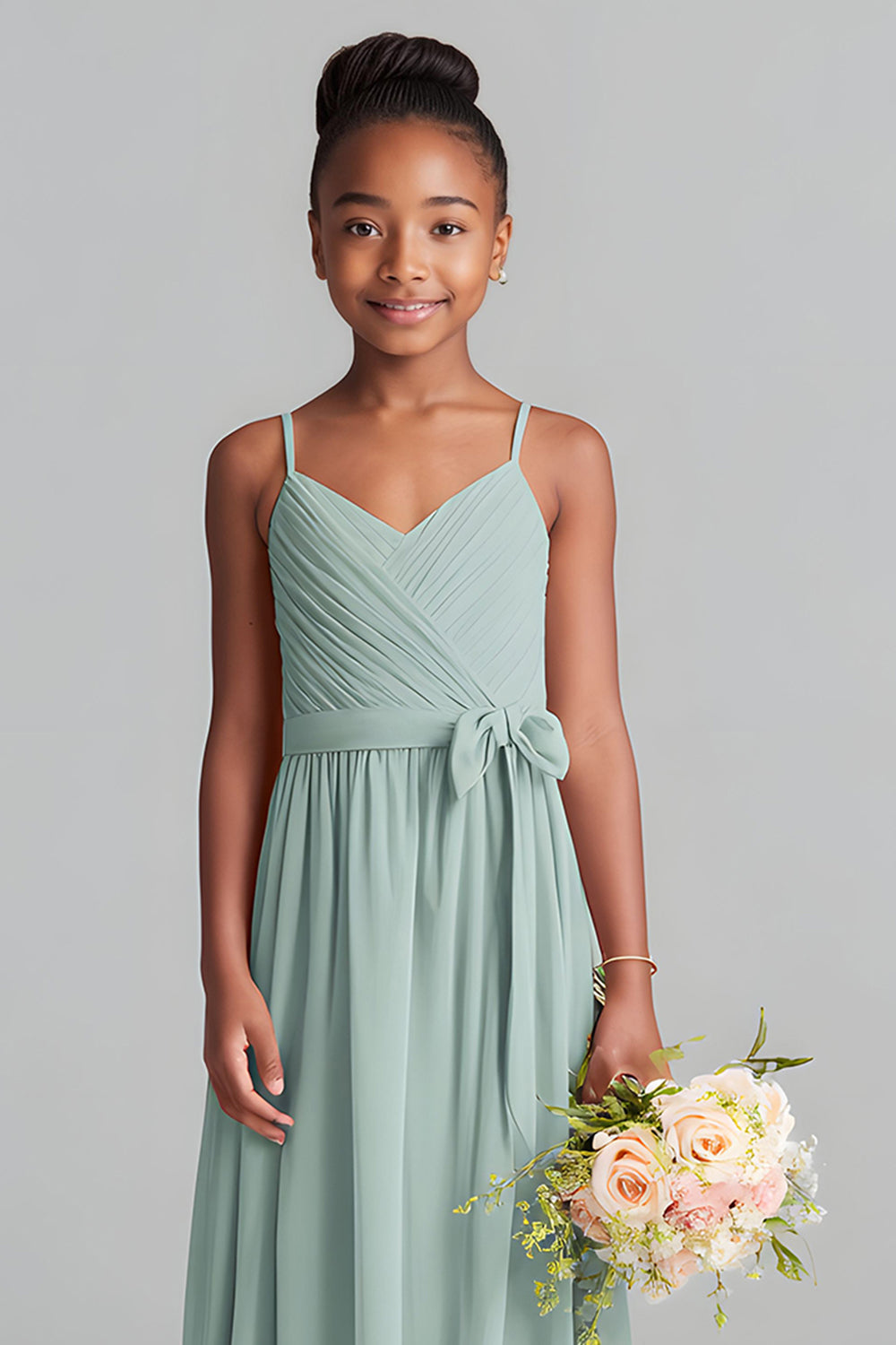 Matcha spaghetti bretelles mousseline de soie A-ligne longue robe de demoiselle d’honneur junior
