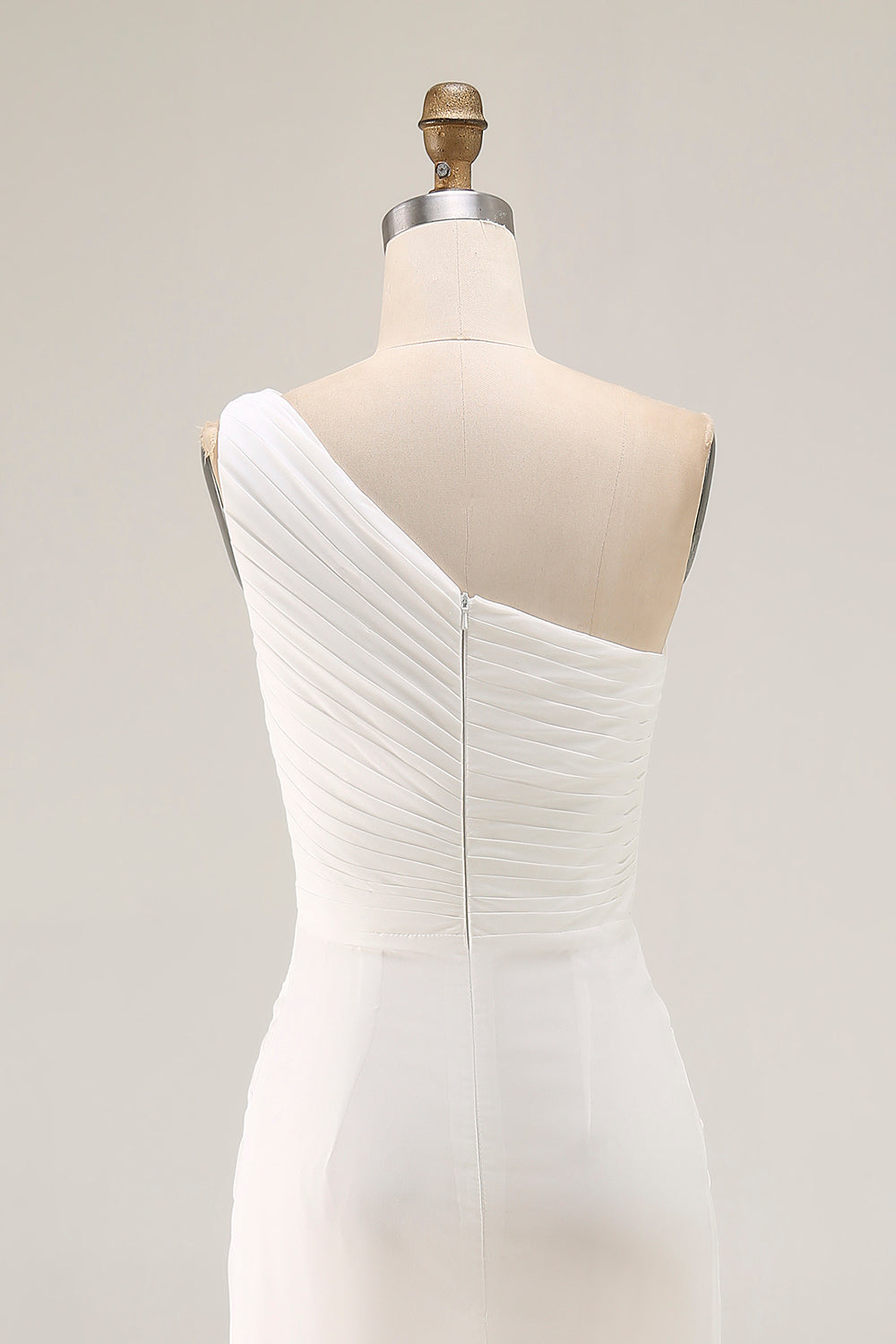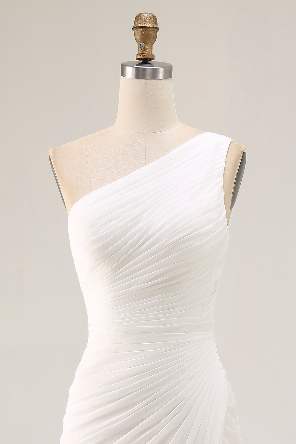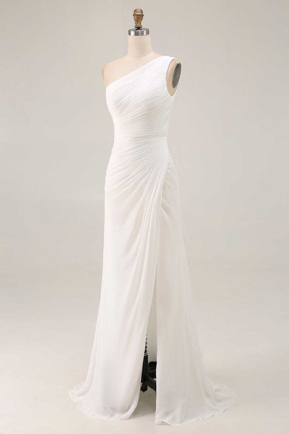 Robe de fiançailles longue ivoire en mousseline de soie une épaule avec fente