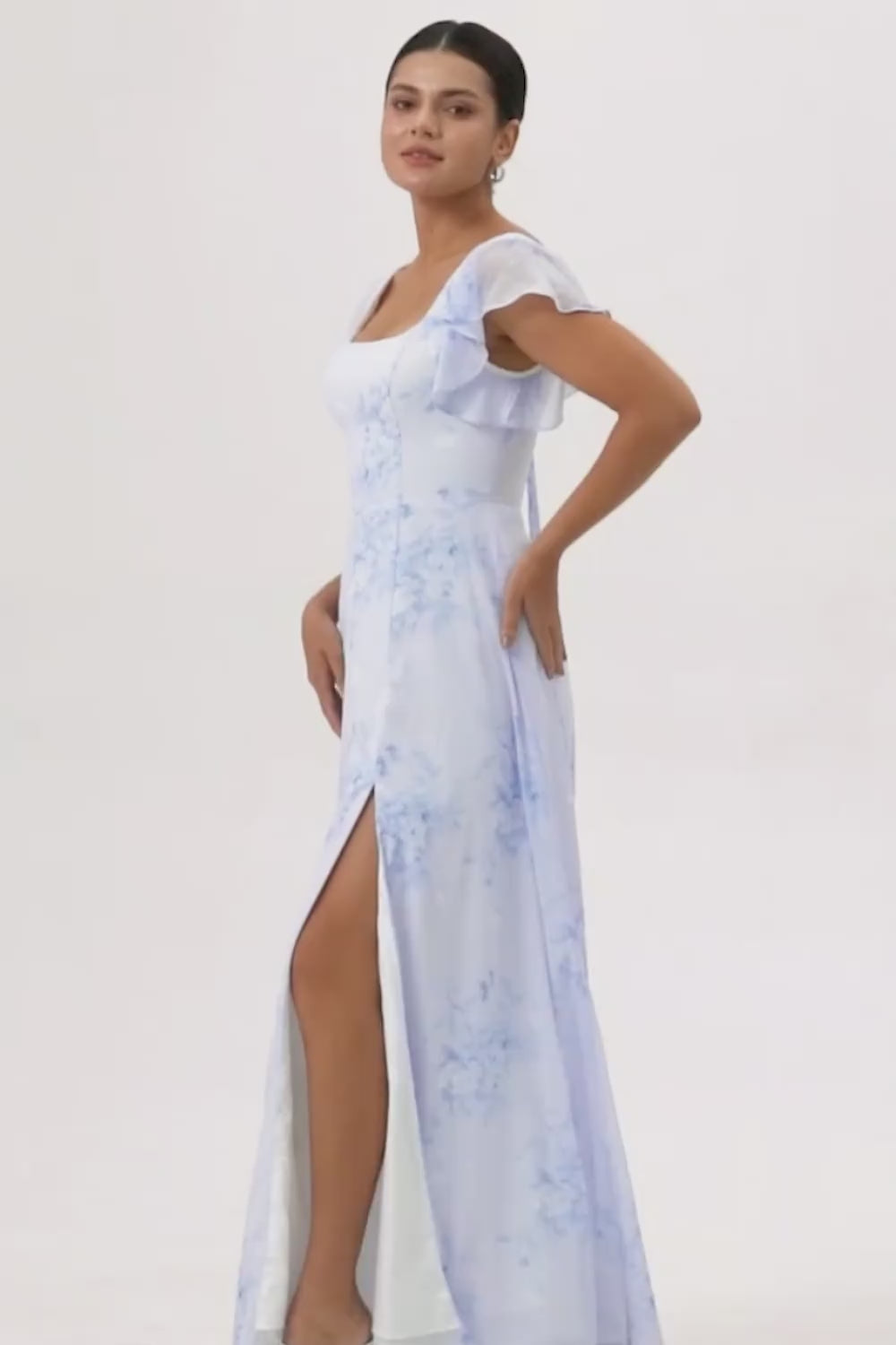 Robe de demoiselle d’honneur longue à col rond floral en mousseline de soie bleue avec volants