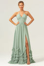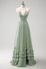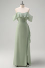Robe de demoiselle d’honneur longue sirène vert clair à épaules dénudées avec fente à volants