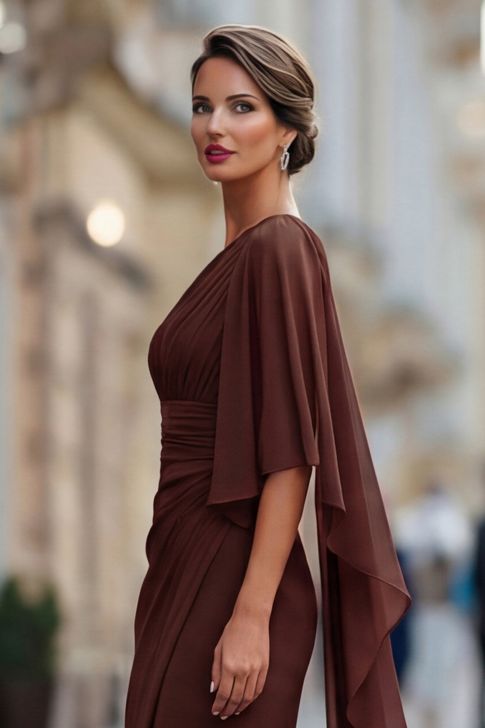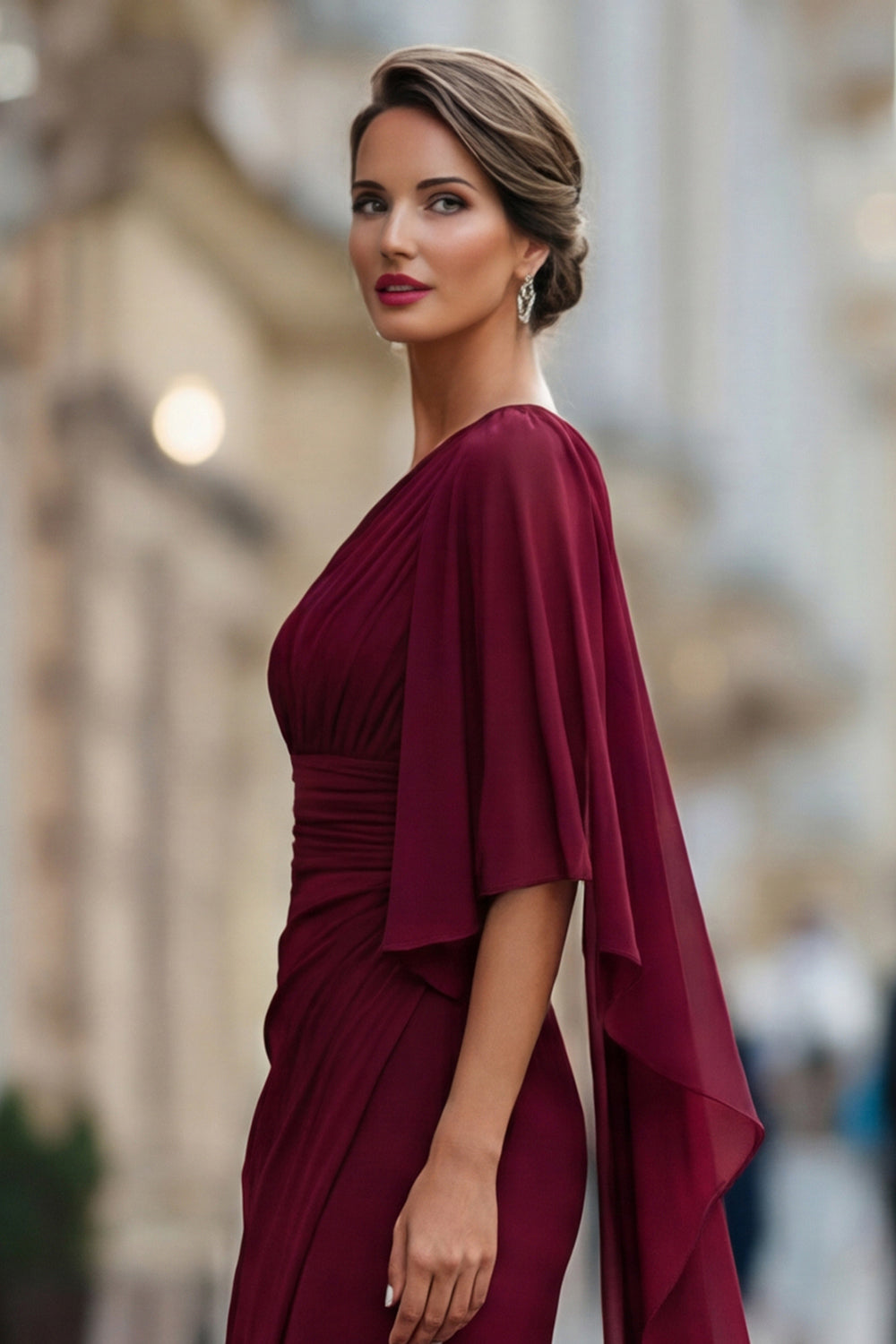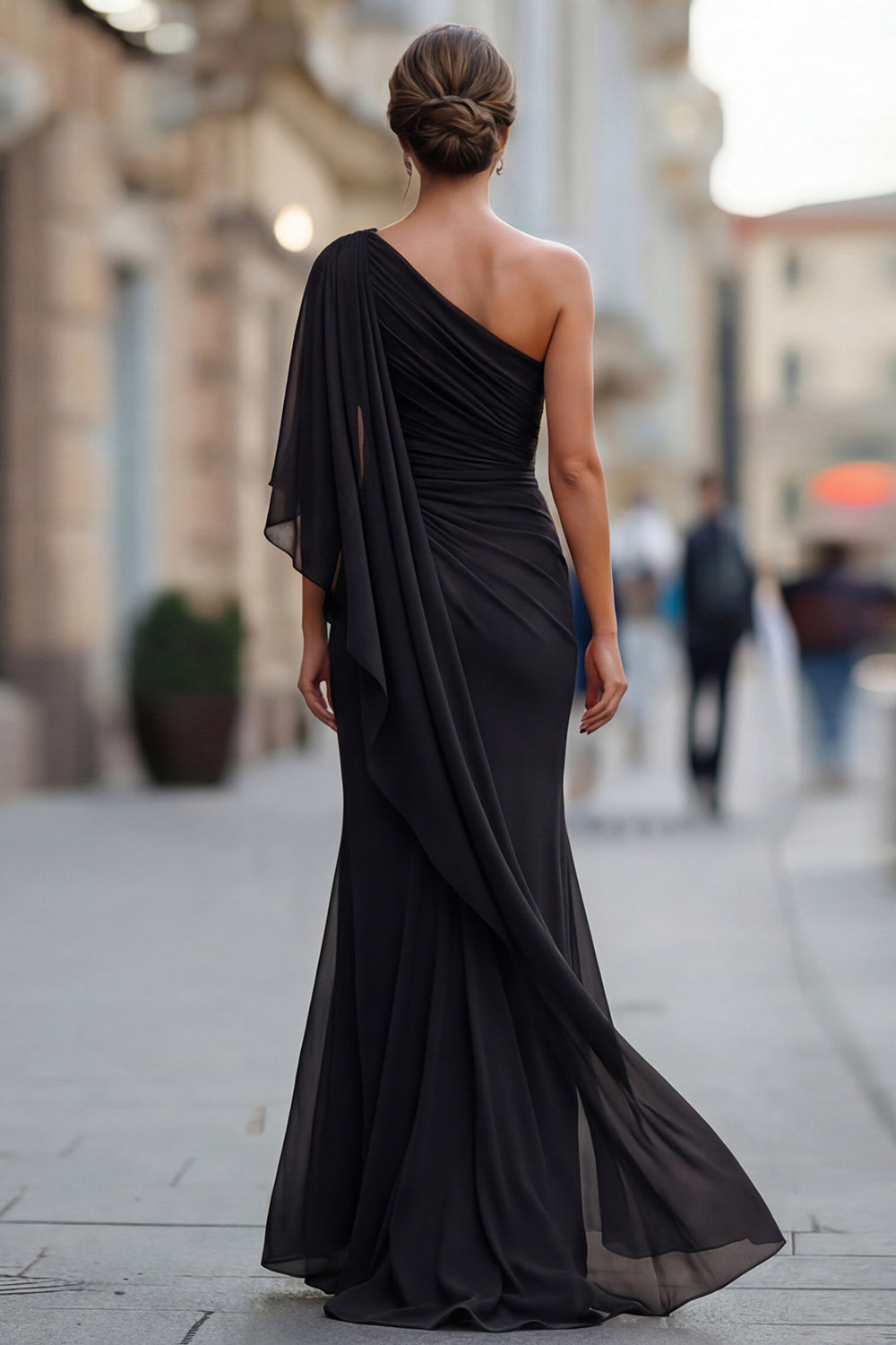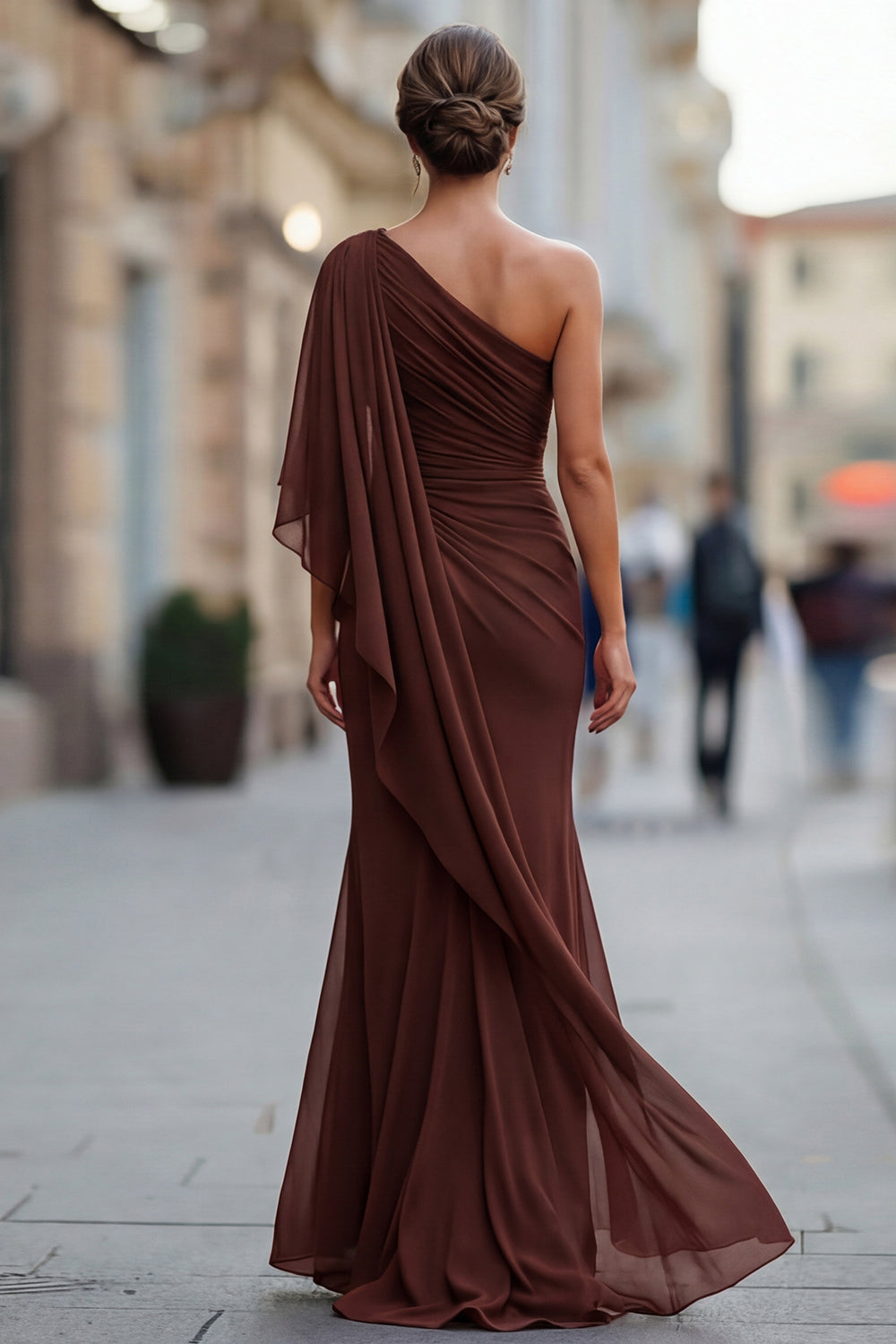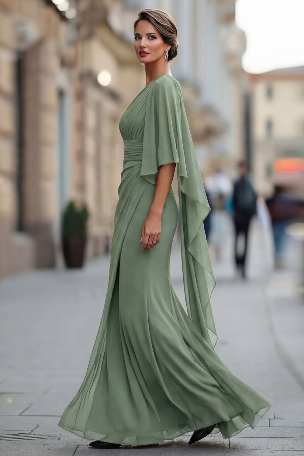 Robe de la mère de la mariée en mousseline en mousseline d’une épaule vert sauge avec manche