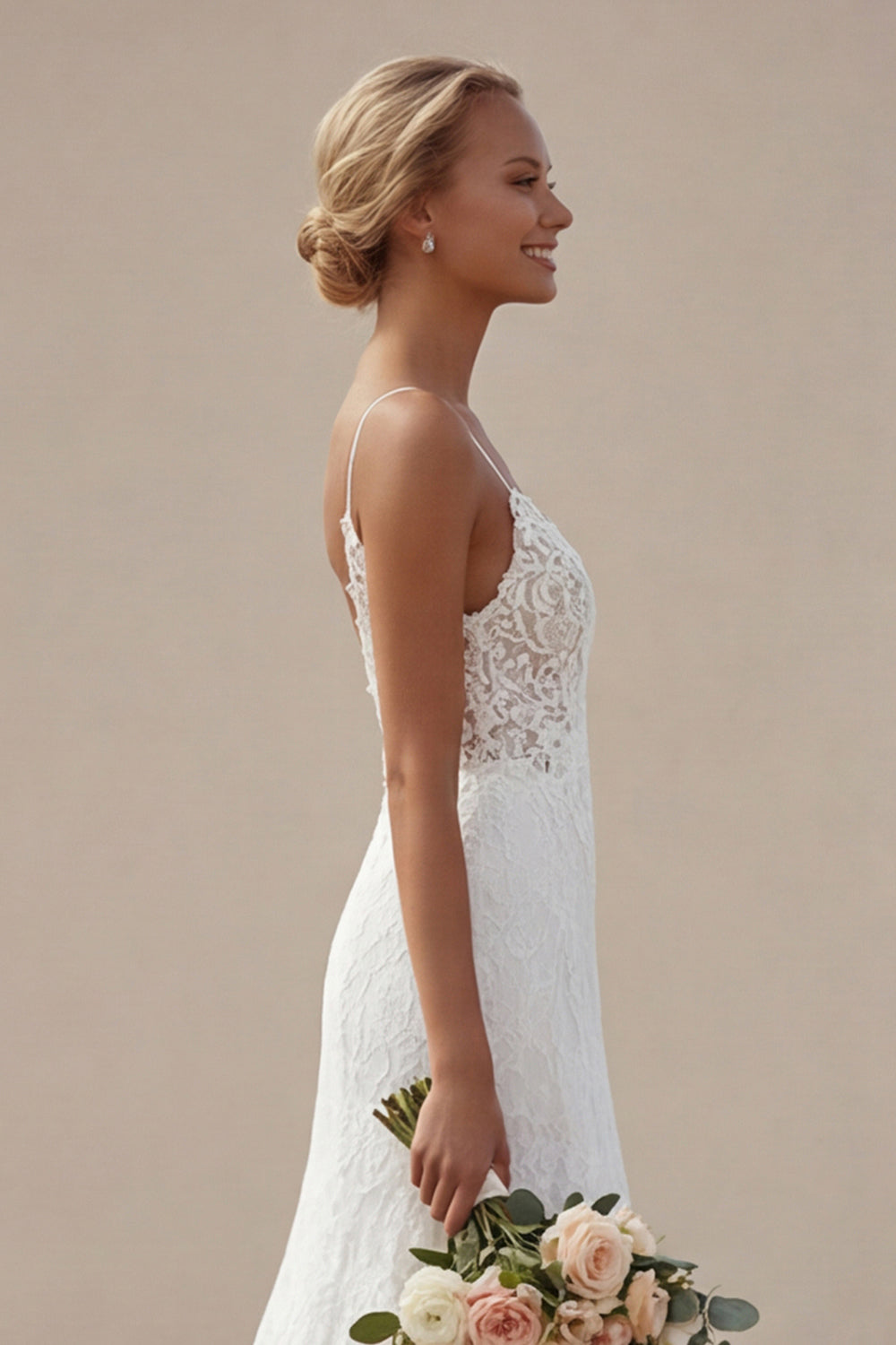 Robe de mariée à bretelles fines en ivoire avec une longue dentelle appliquée en A et fendue