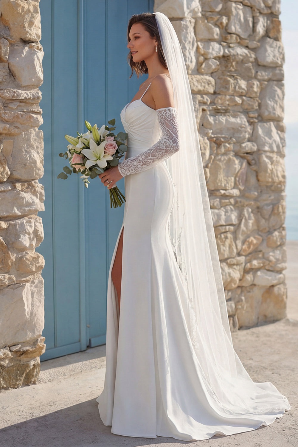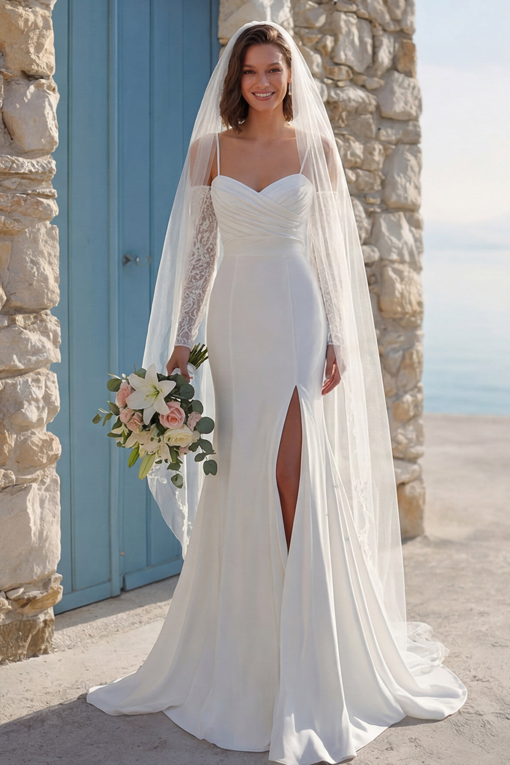 Robe de mariée en train à bretelles fines en mer en ivoire avec fente