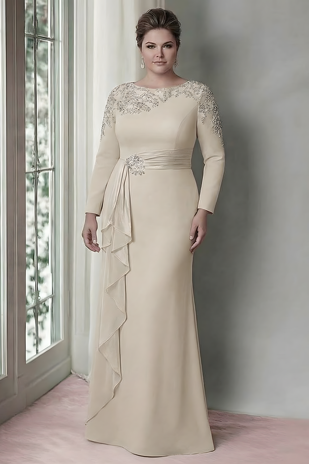 Robe de mère de la mariée en satin à manches longues à fourreau à fardettes à manœuvres