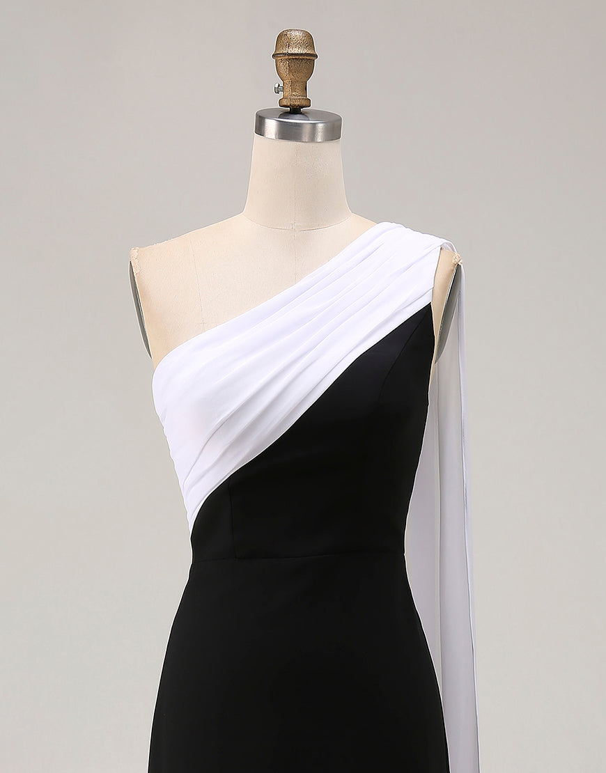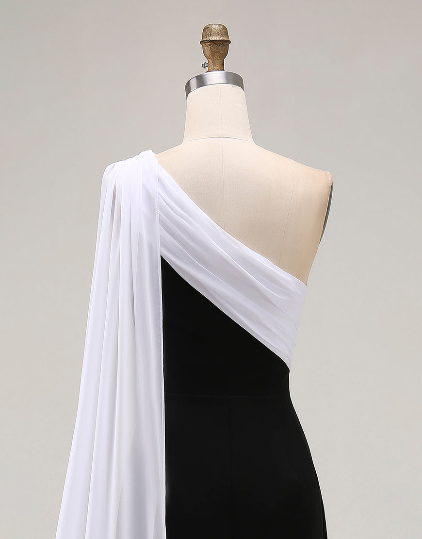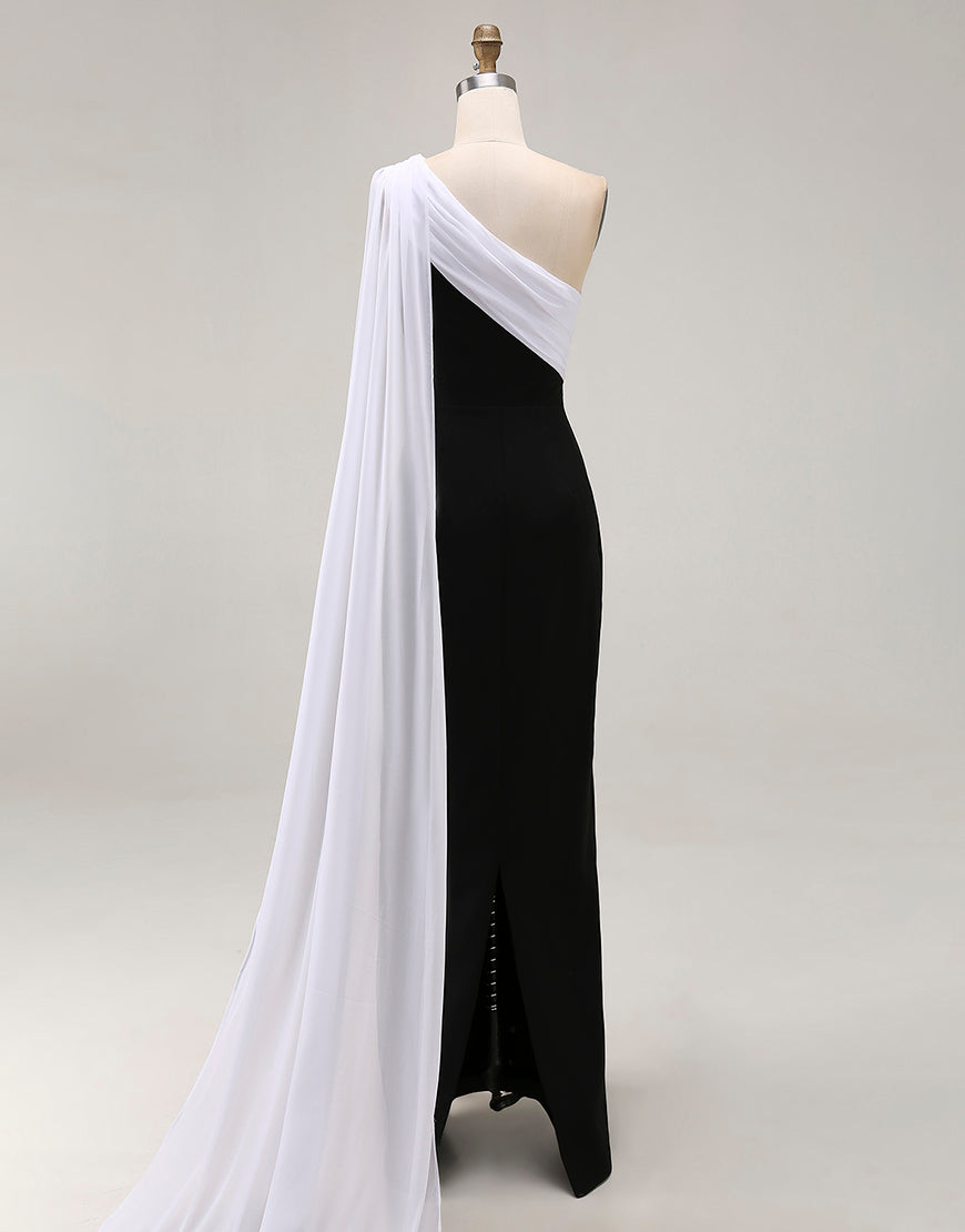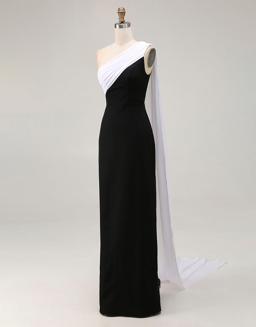Robe longue cravate noire fourreau à une épaule avec banderole
