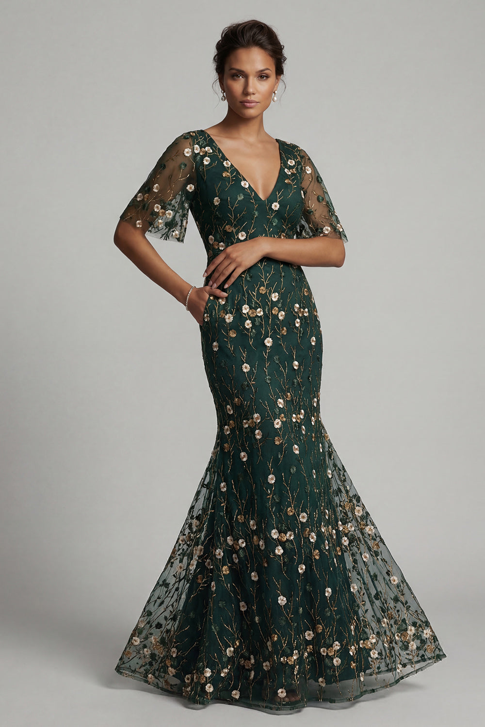 Robe longue de mère de la mariée brodée de sirène vert foncé avec manches courtes