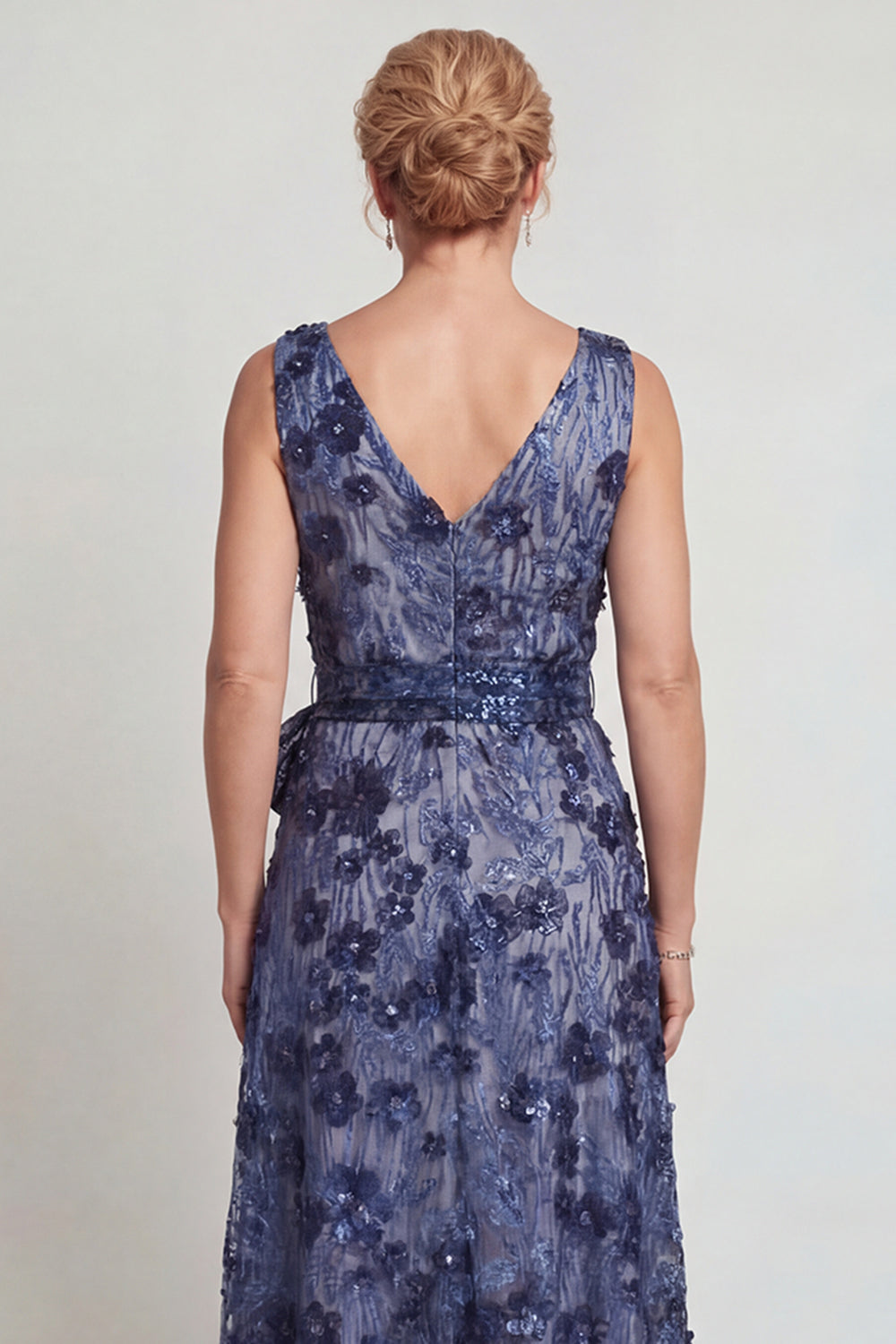 Robe mère de la mariée longue fleur bleu bleu foncé à col en V et nœud papillon