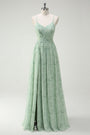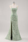 Une ligne de fleurs vertes volants bretelles longue robe de bal corset avec fendu sur le devant
