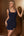Mini robe de soirée court moulante scintillante à col carré bleu foncé avec fente