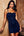 Robe de cocktail moulante froncée à bretelles spaghetti bleu marine