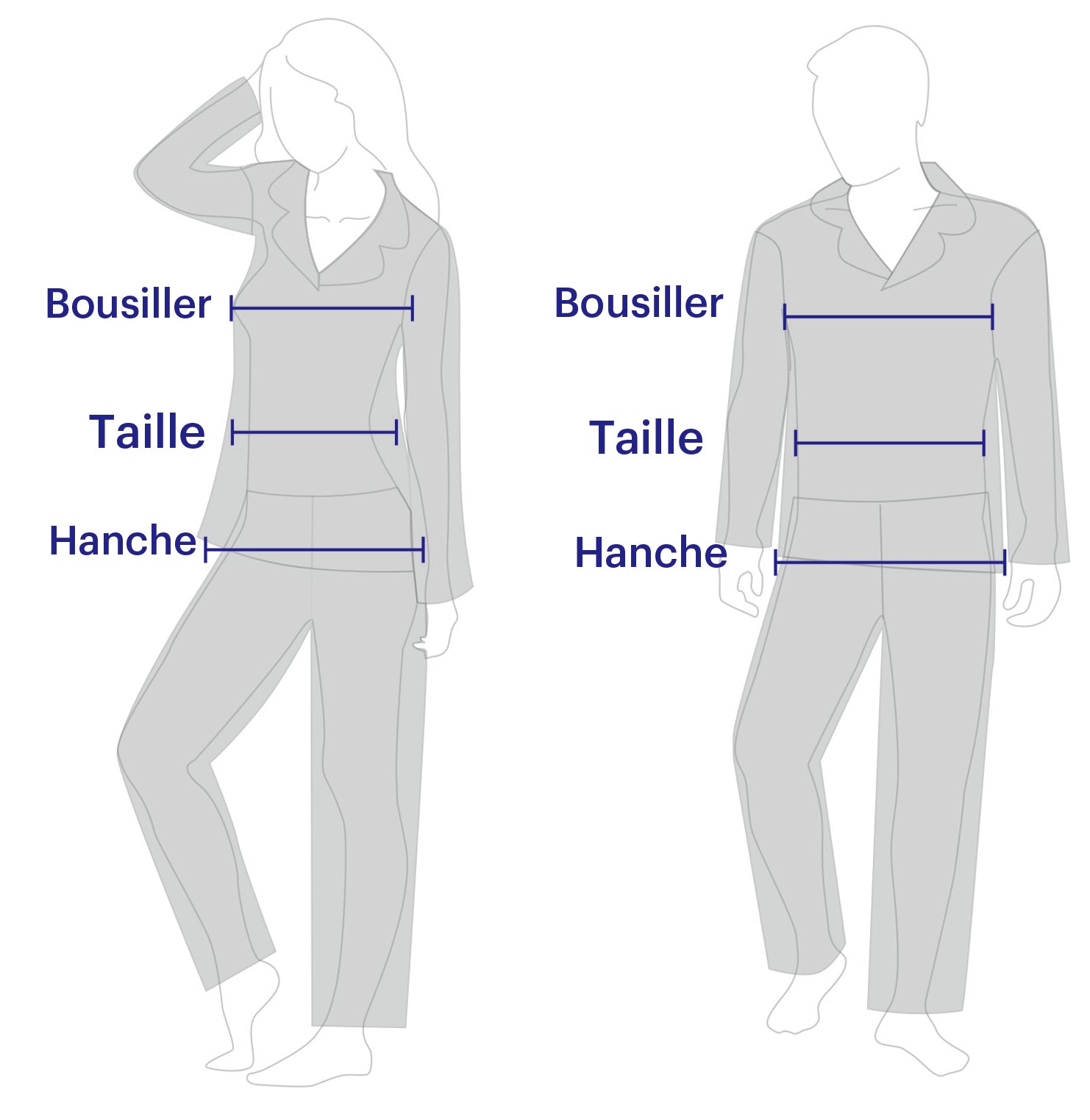 Tour de hanches: Mesurez horizontalement à l'endroit le plus fort du fessier.