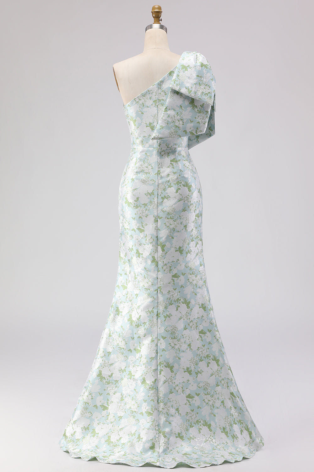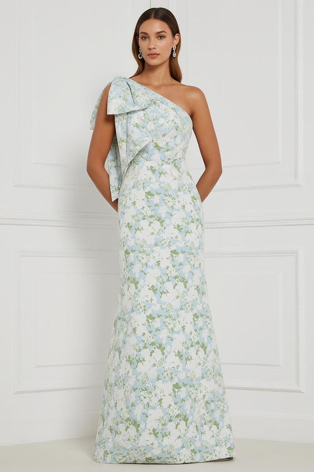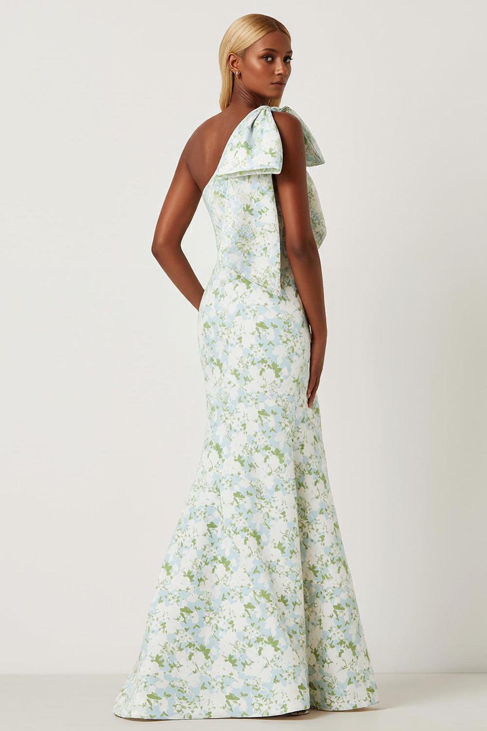 Robe longue de demoiselle d’honneur à motif de fleur blanche bleue et épaule avec un nœud