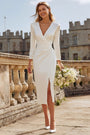 Cette robe midi blanche à manches longues sublime la silhouette avec une coupe fourreau/column qui épouse délicatement vos formes. Le décolleté en V ajoute une touche de féminité subtile et raffinée, tandis que la fente discrète assure confort et aisance de mouvement. Parfaite pour vos fiançailles, cérémonies ou événements spéciaux, cette robe incarne à la fois élégance, sophistication et confiance en soi, pour que vous brilliez à chaque instant.