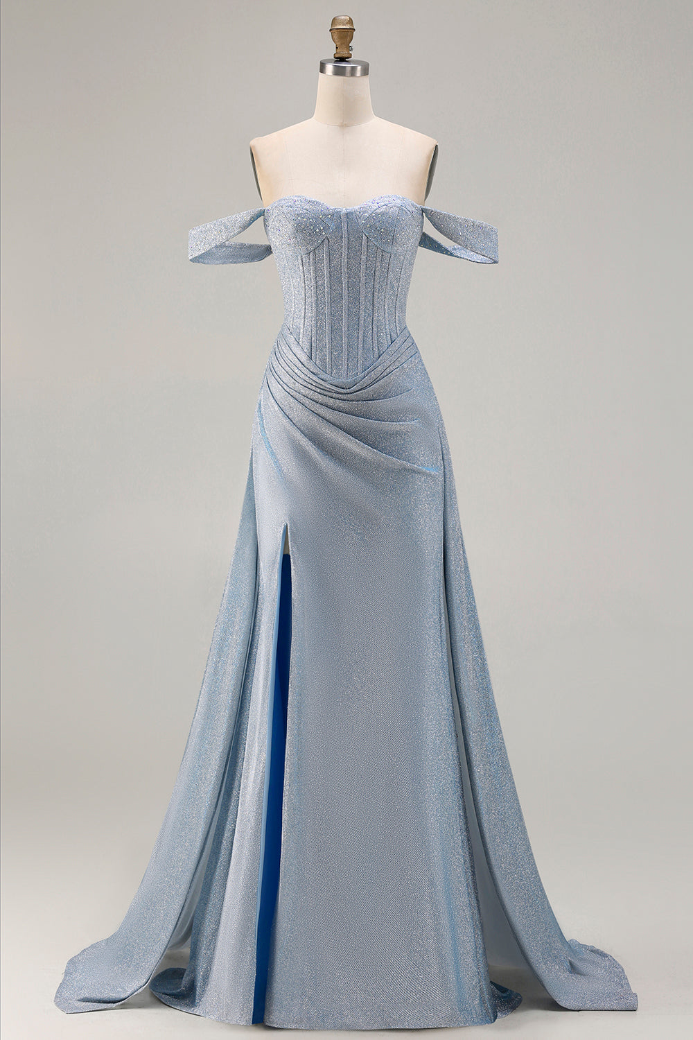 Robe de soirée longue sirène scintillante à épaules dénudées en satin bleu poussiéreux avec fente