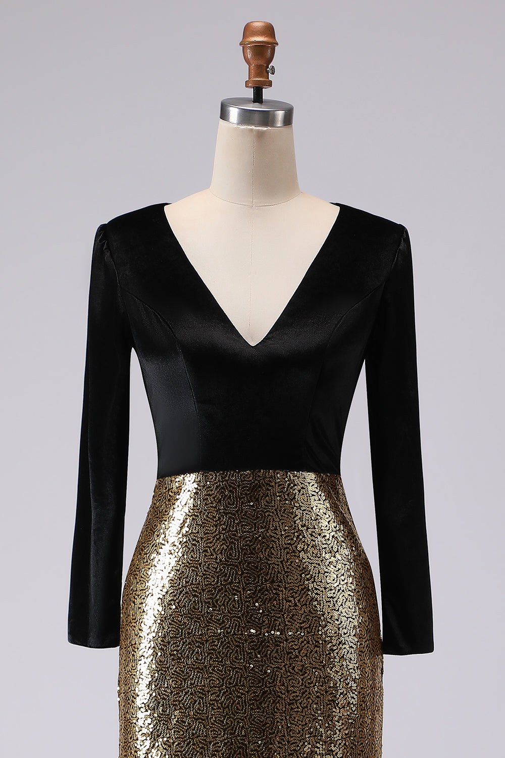 Robe longue formelle à col en V doré et noir scintillant