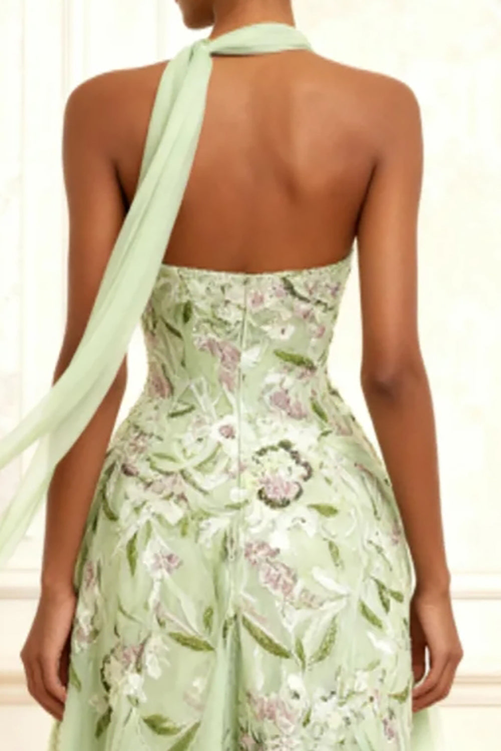 Dusty Sage Robe de bal longue trapèze brodée avec fente