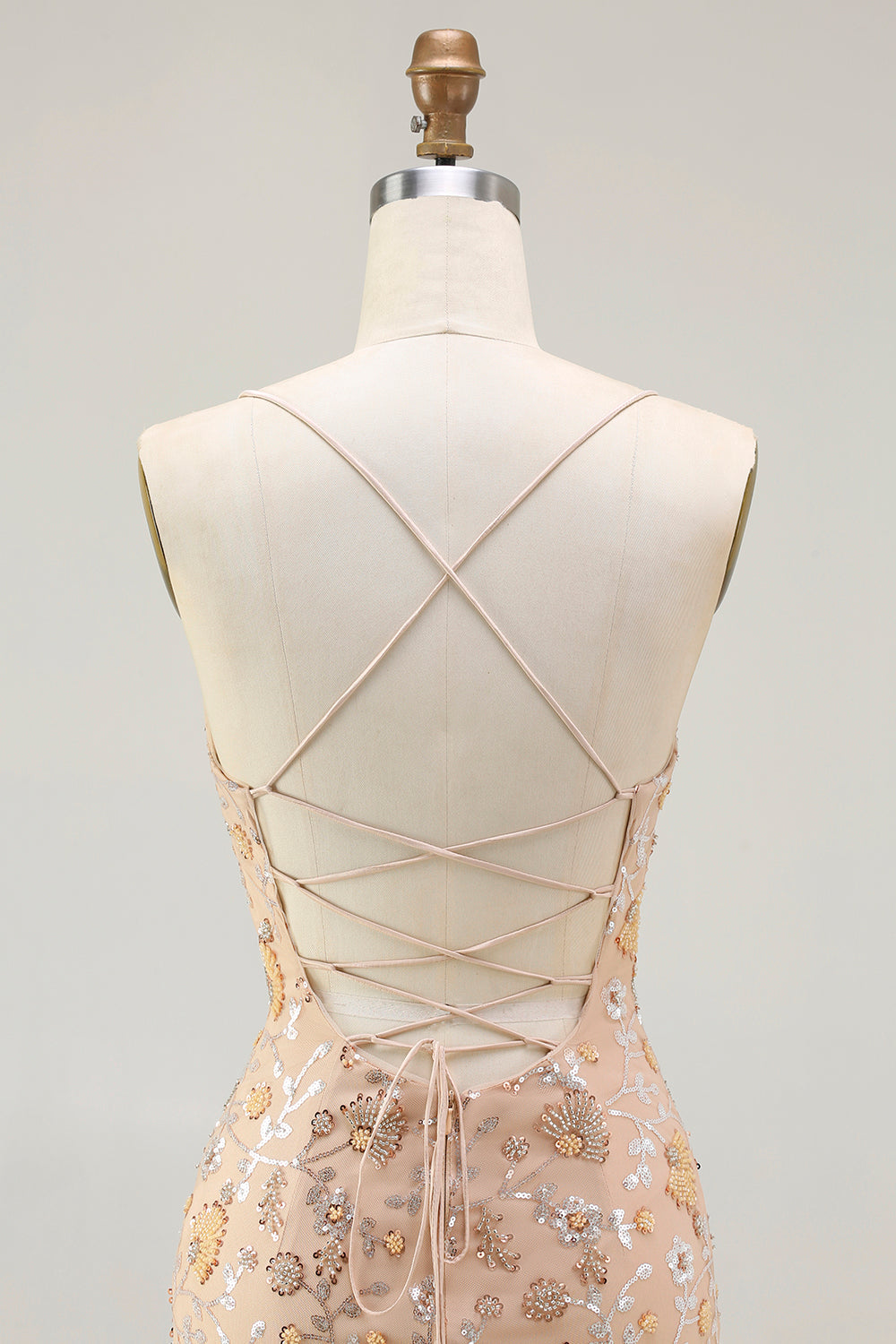 Sirène perlée de champagne, laille à sequins relevée dans le dos, longue robe de bal avec fente