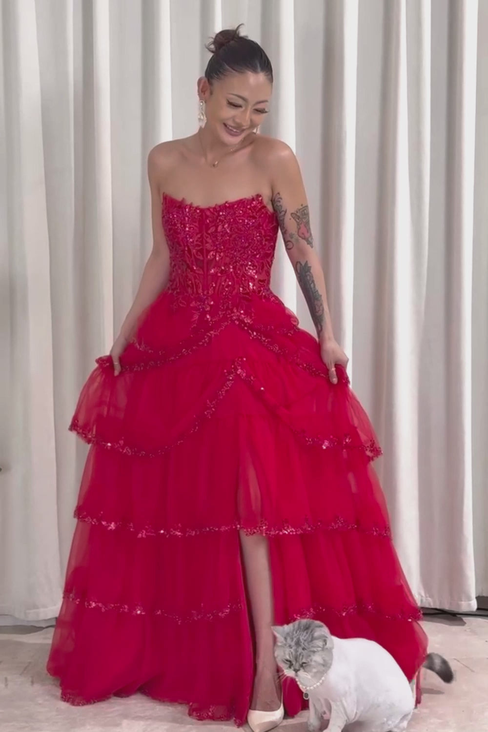 Cette robe de soirée spectaculaire est idéale pour les occasions élégantes. Elle présente une silhouette fluide et légère, décorée de strass étincelants et de volants délicats qui ajoutent une touche de glamour. Le bustier orné de détails en strass met en valeur la taille, tandis que la jupe à plusieurs volants crée un effet majestueux en mouvement.