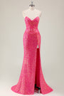 Robe de bal longue scintillante fuchsia sirène sans bretelles à paillettes avec fente