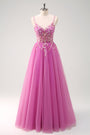 Robe de soirée longue en tulle à bretelles spaghetti et coupe trapèze Sage avec applications
