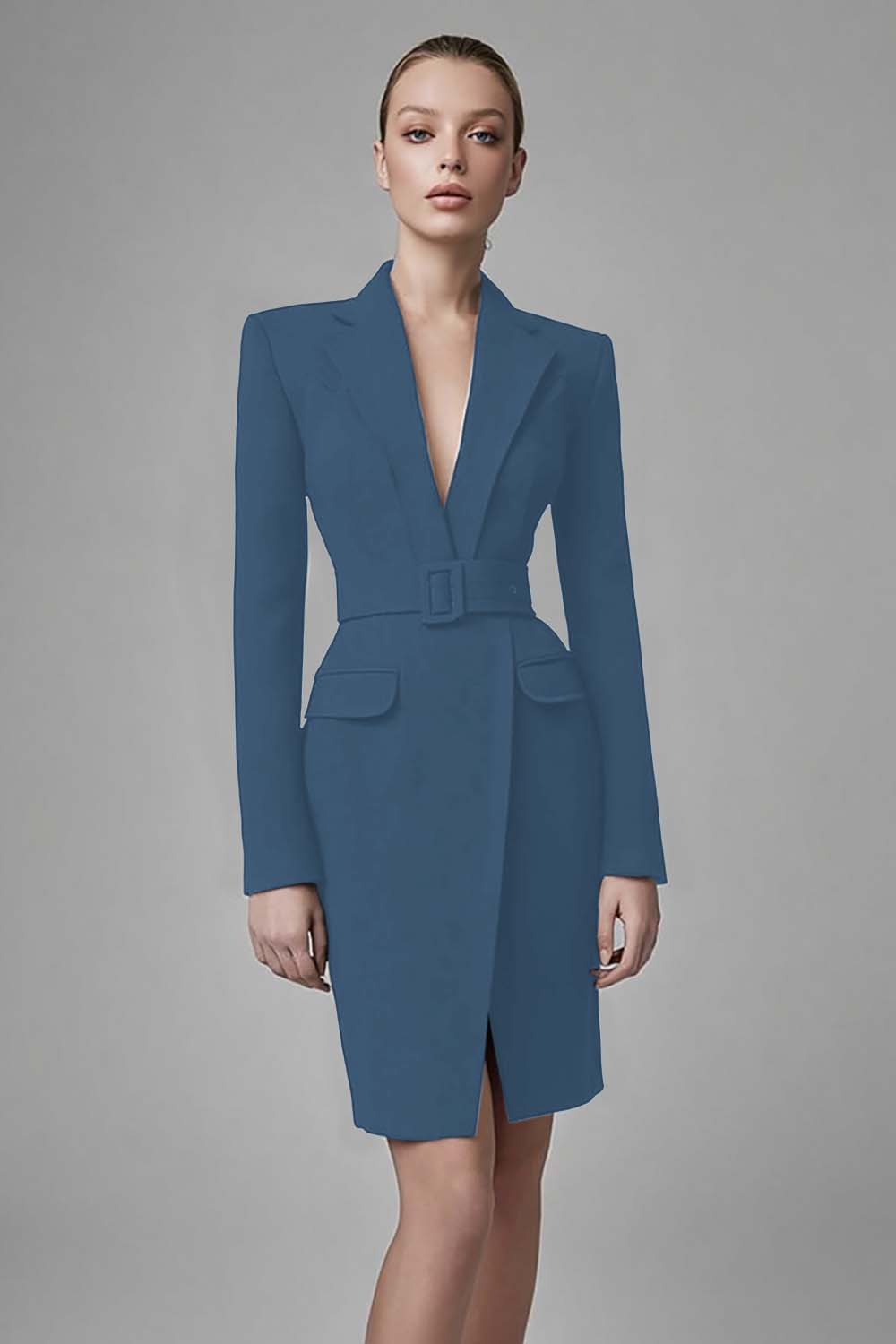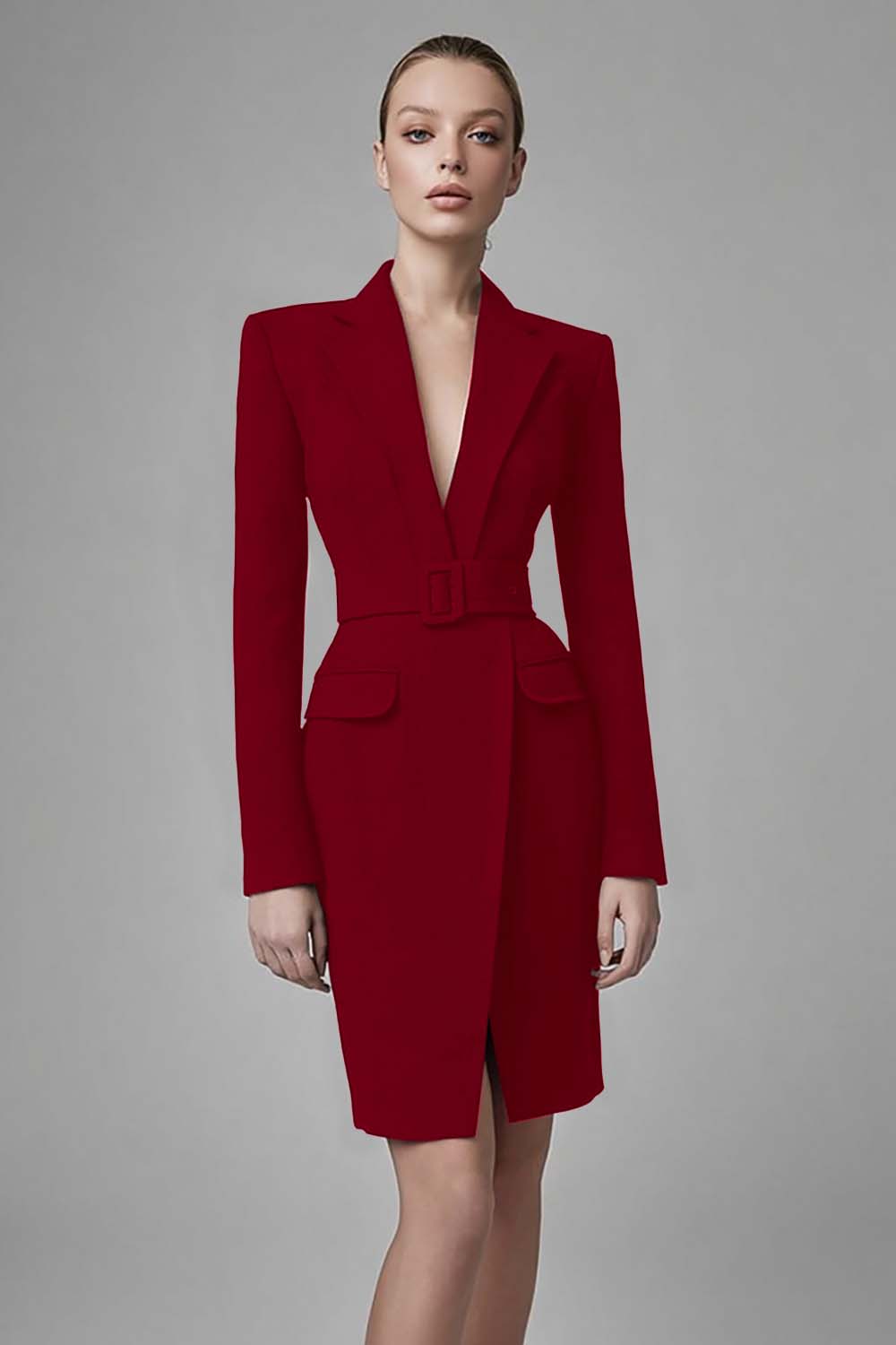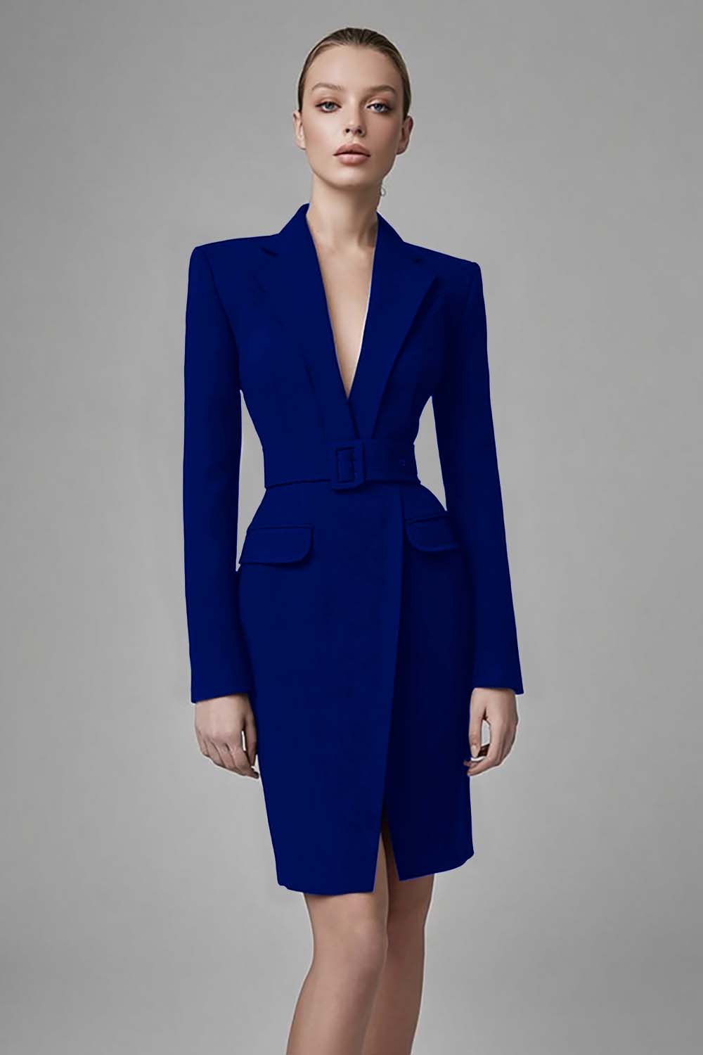 Sa coupe tailleur précise allonge la silhouette tandis que le décolleté V profond apporte une touche féminine subtile mais affirmée.