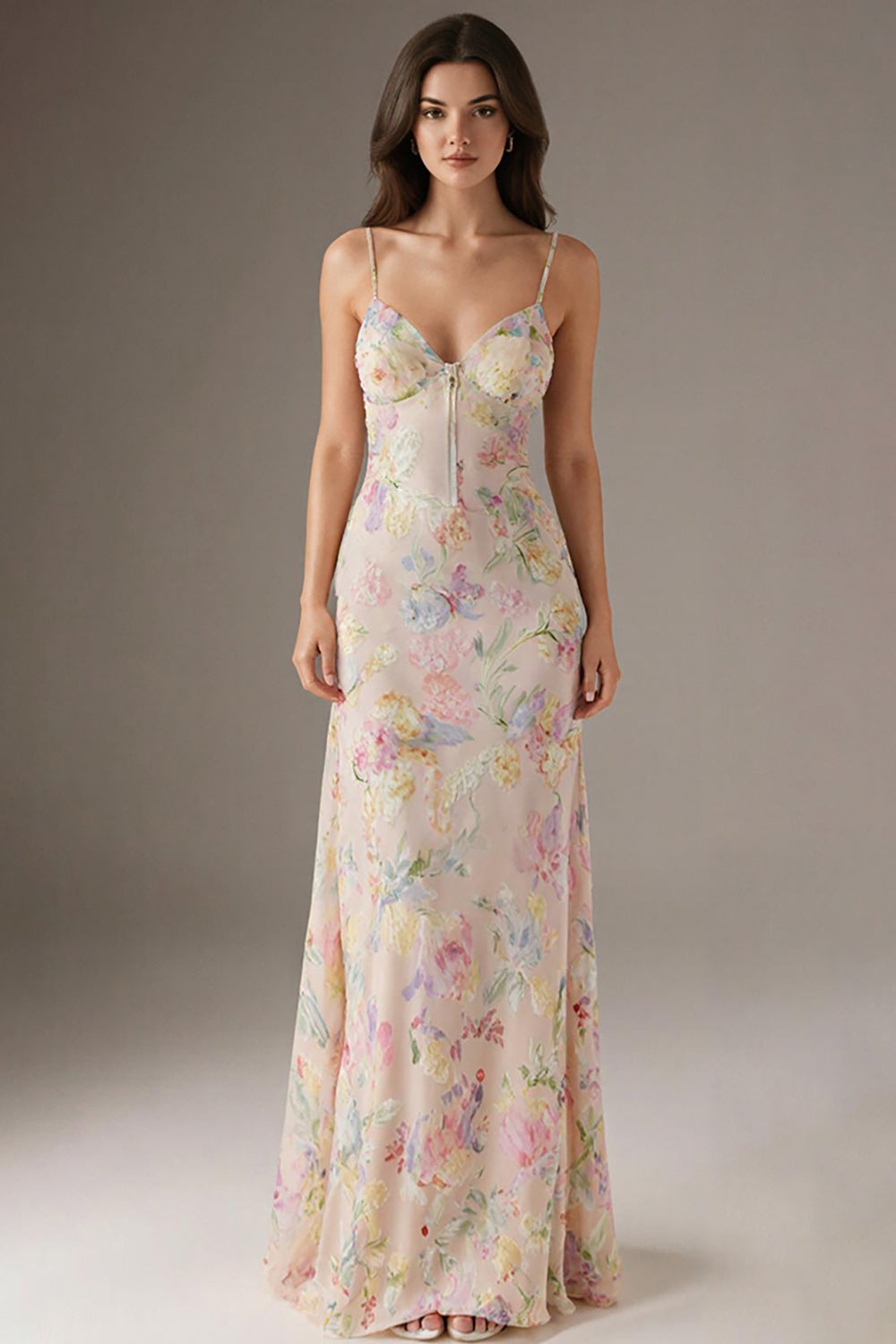 Robe de soirée à bretelles spaghetti roses fourreau floral