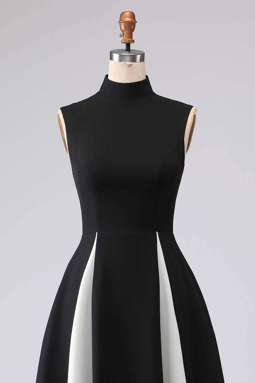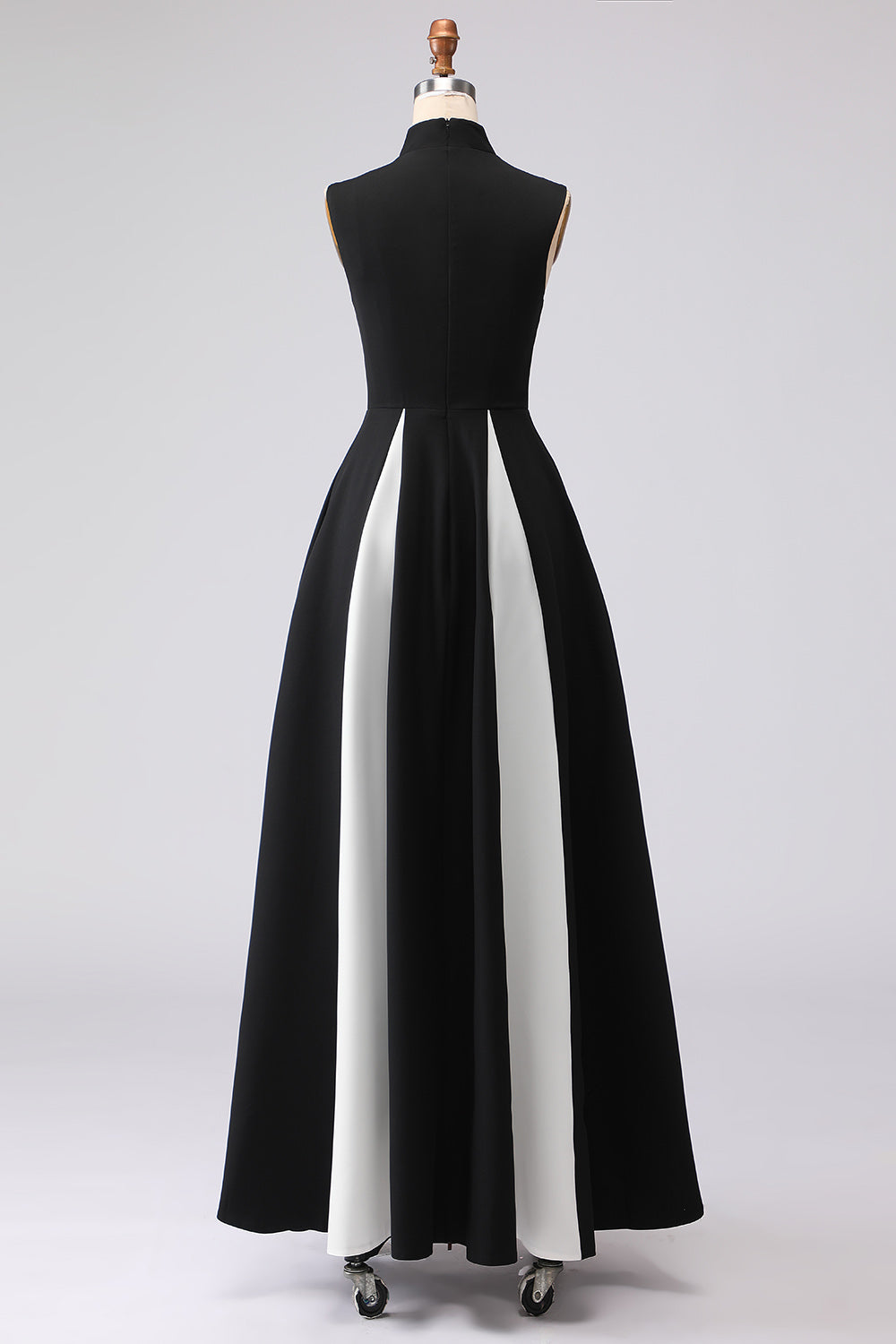 Élégante robe longue formelle trapèze noire et blanche à col haut