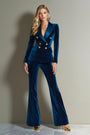 Cette veste en velours bleu offre une allure moderne et élégante, parfaite pour les occasions formelles et spéciales. Le tissu en velours doux et luxueux apporte un éclat subtil, tandis que la coupe ajustée souligne délicatement la silhouette féminine. Le design à bouton unique et les détails soignés ajoutent une touche de sophistication, et le pantalon assorti complète l’ensemble pour une tenue complète et raffinée.
