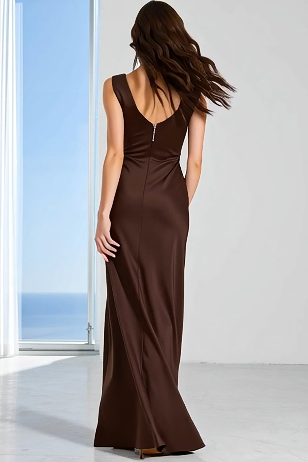 Robe longue de demoiselle d’honneur à col bateau café