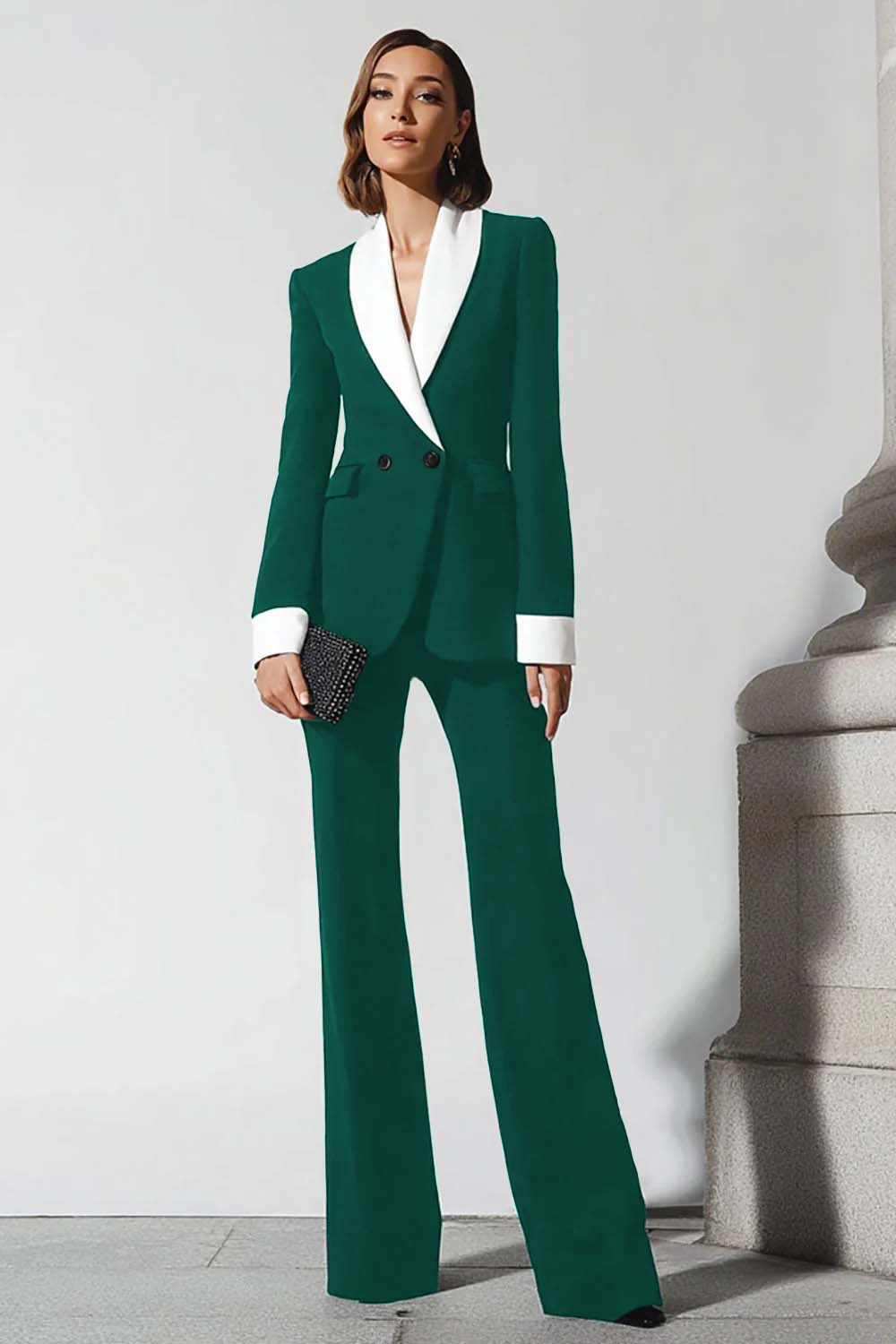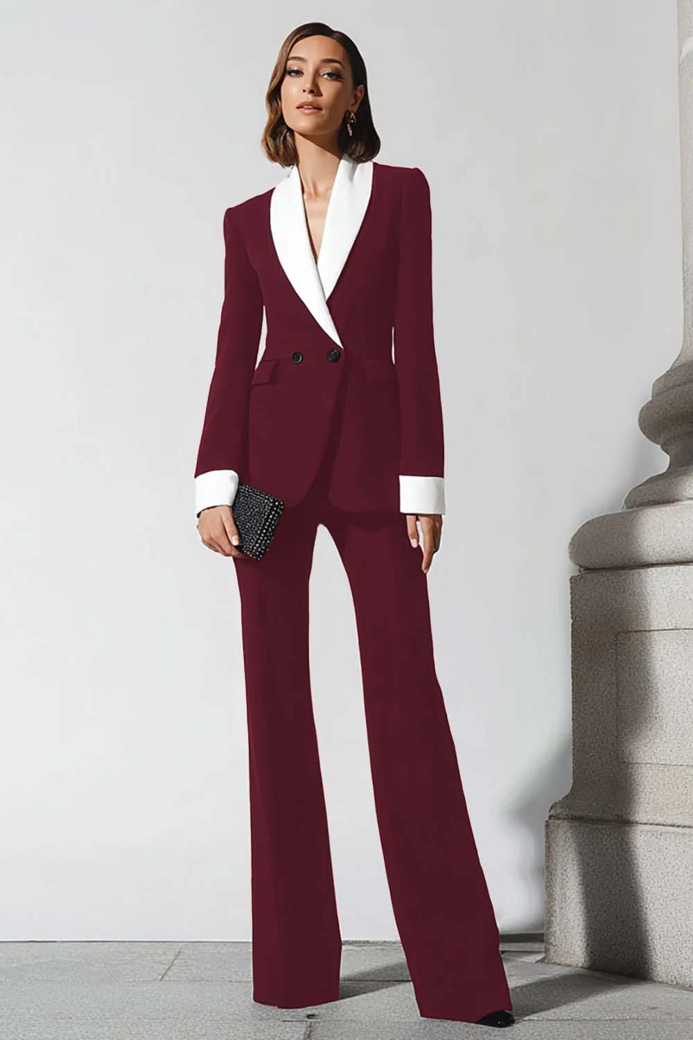 Costume d’affaires femme 2 pièces noir jupe évasée pantalon à revers châle