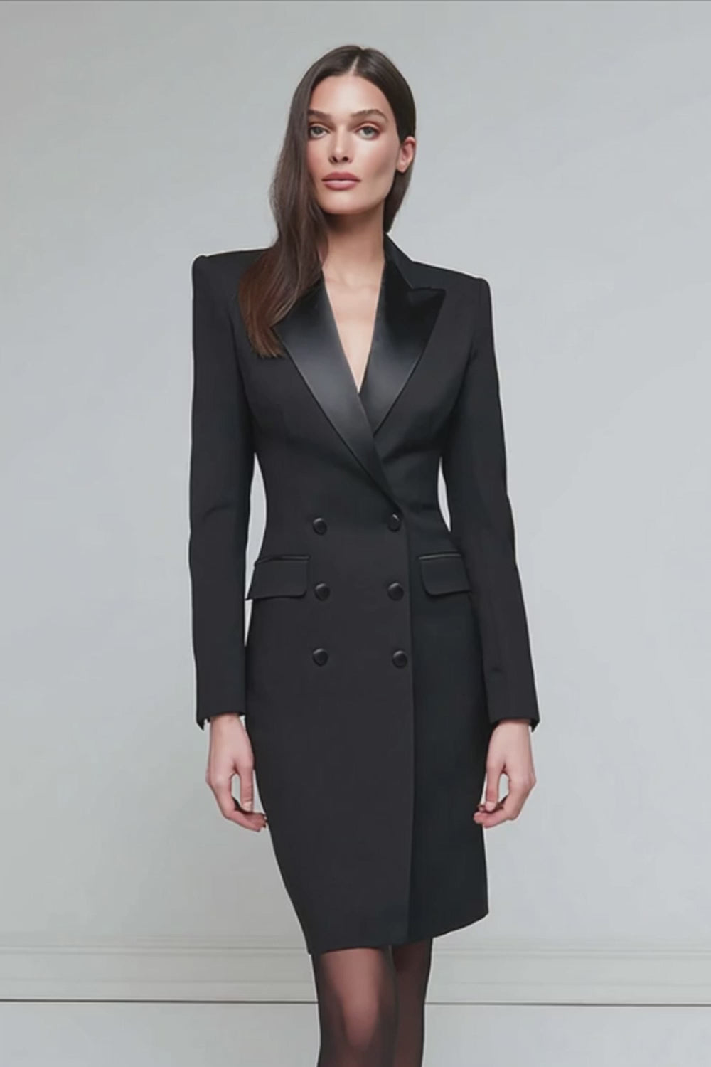 Adoptez une allure sophistiquée et moderne avec cette robe tailleur noire qui allie confort et élégance. Confectionnée dans un tissu de qualité, elle présente un col châle satiné qui apporte une touche de luxe. Le modèle à double boutonnage et la coupe ajustée accentuent la silhouette tout en offrant une coupe parfaitement structurée.