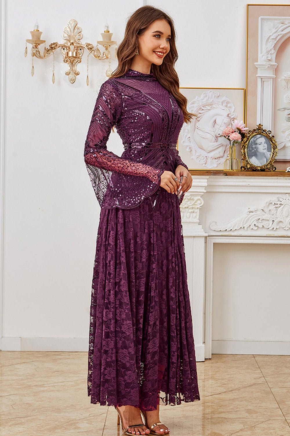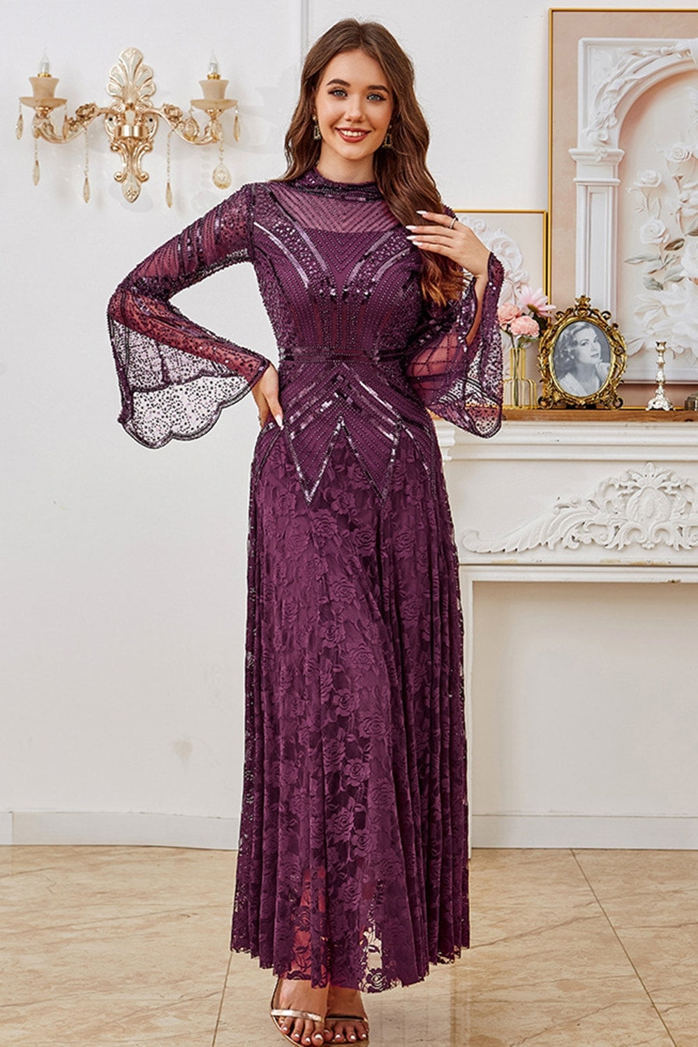 Robe de la mère de la mariée à manches longues à perles perlées violet foncé