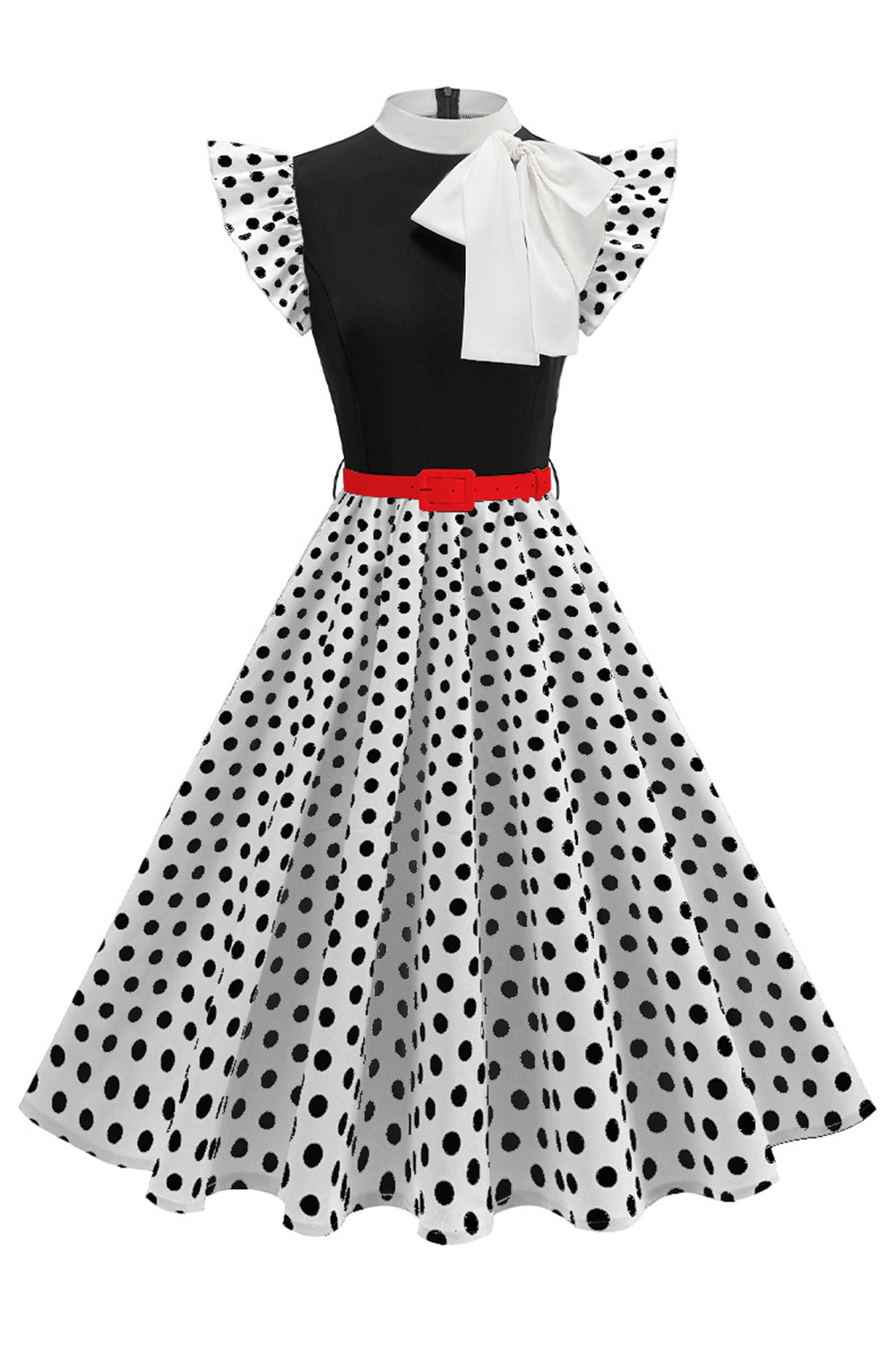 Robe des années 1950 à pois noirs à col montant A Line avec nœud