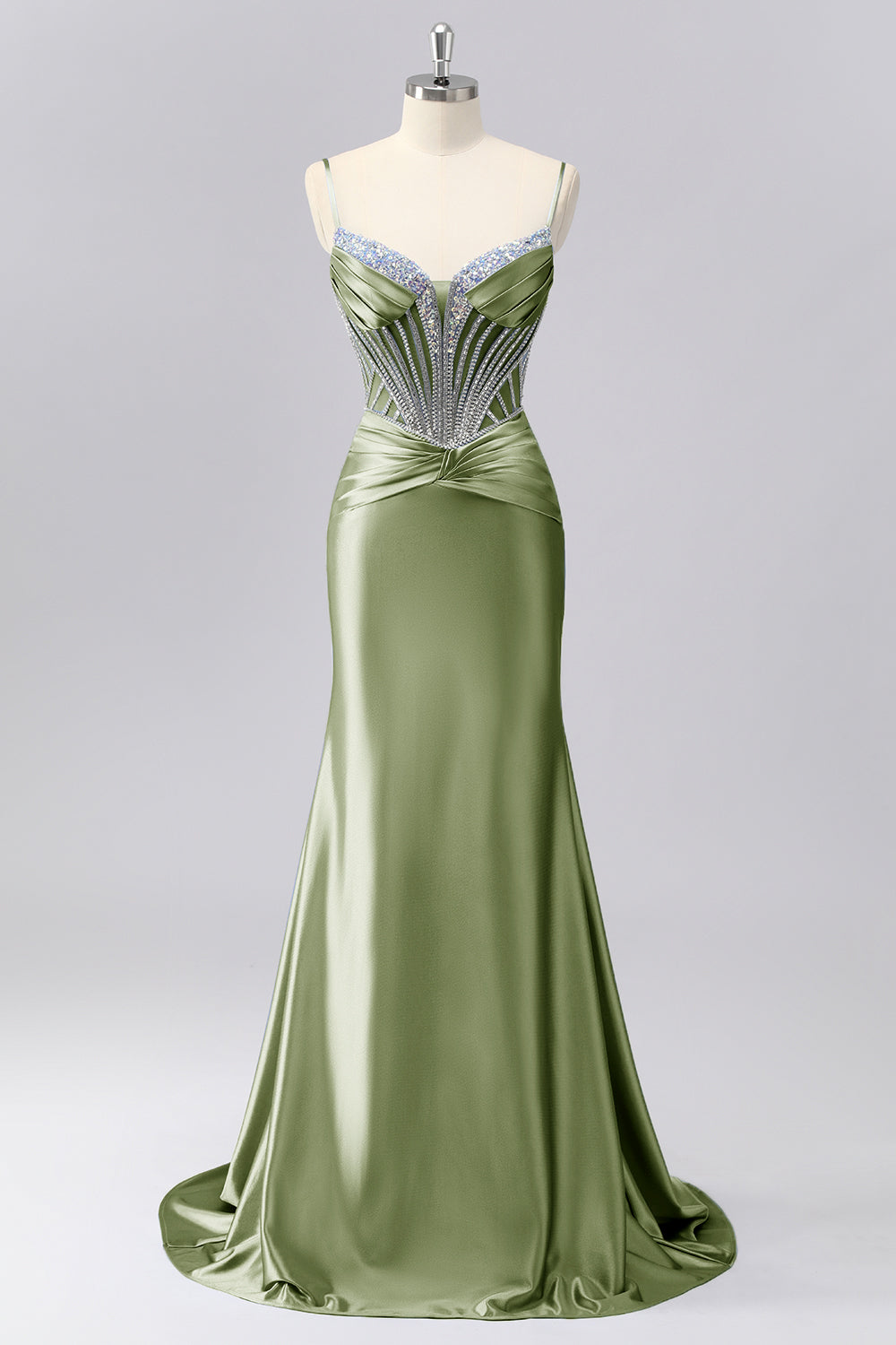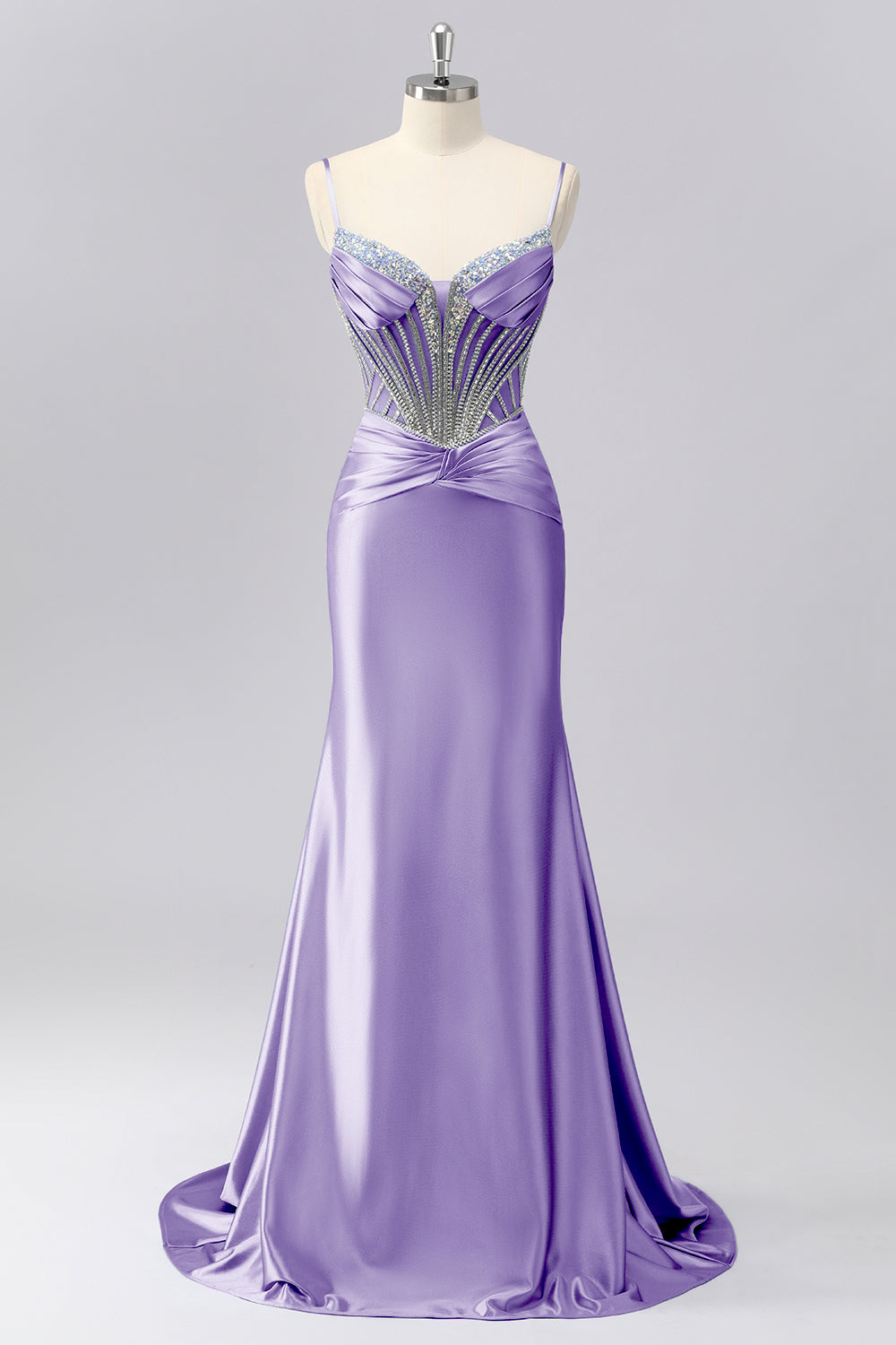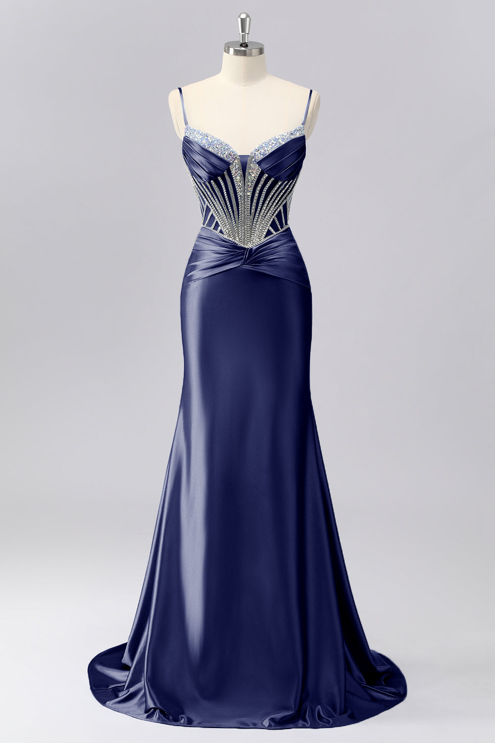 Robe de soirée sirène froncée en satin gris bleu corset scintillant décorée de strass