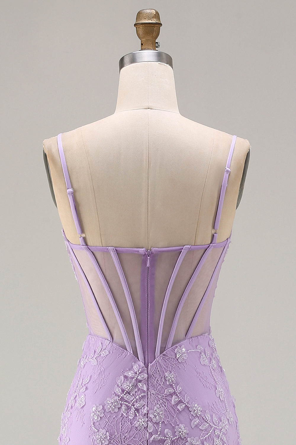 Corset transparent sirène violette à bretelles fines à bretelles en dentelle avec perles et longue robe de bal avec fente