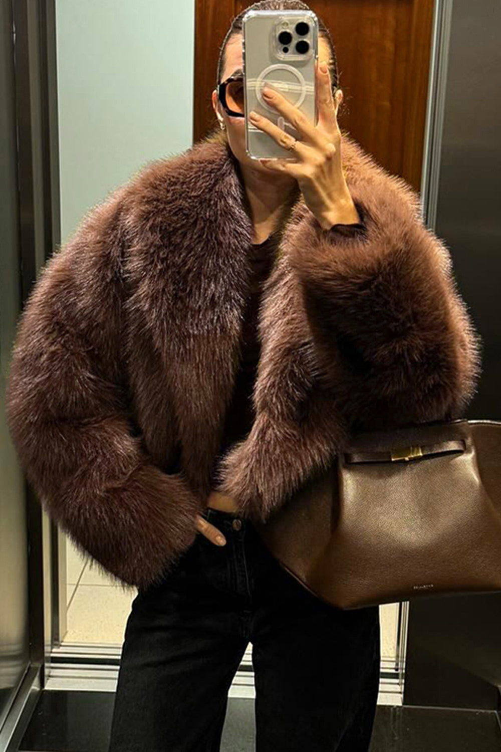 Manteau court d’hiver pour femmes en fausse fourrure châle marron