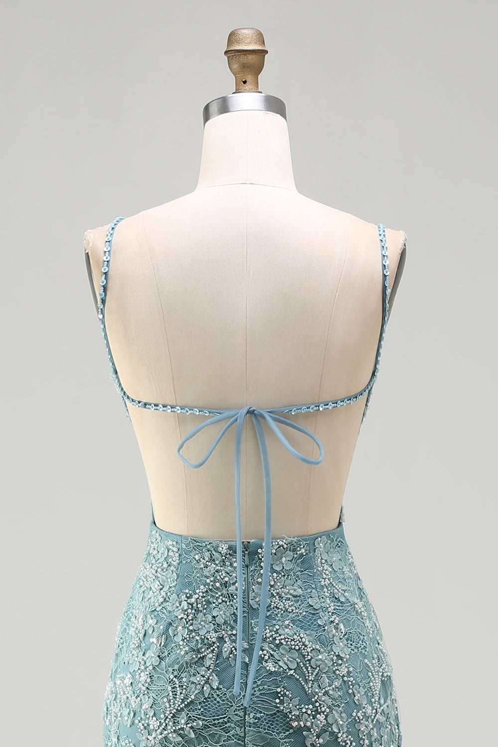 Robe de bal longue de bal en application dorsal nue à perles de sirène gris-vert avec fente
