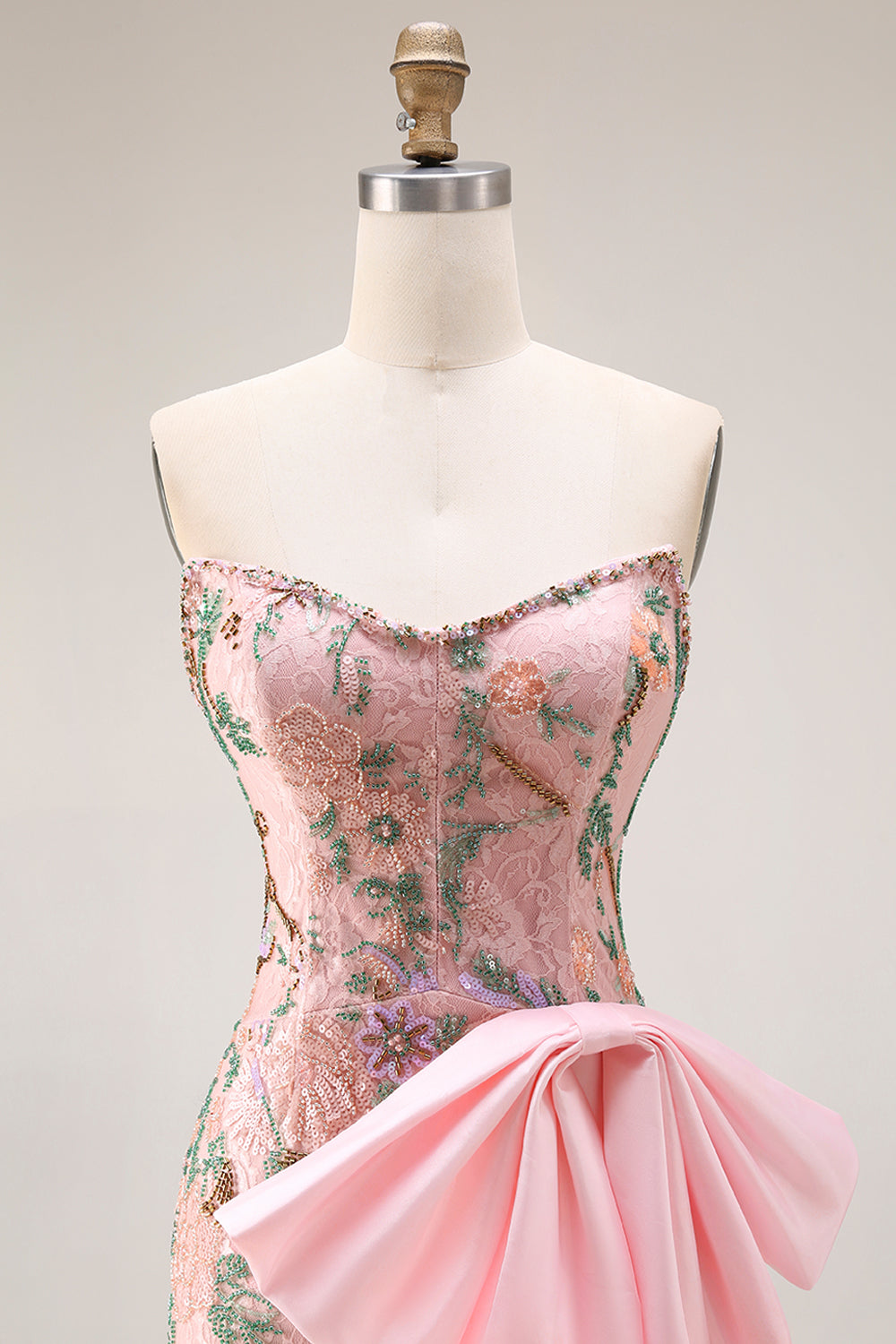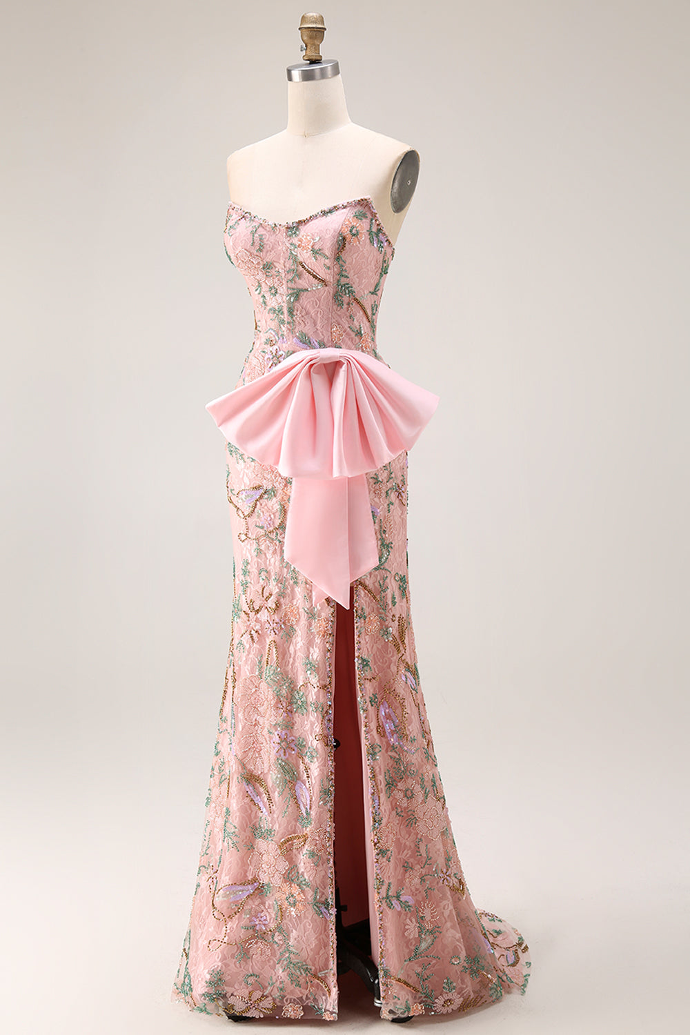 Robe de bal longue florale perlée en sequins sans bretelles avec un nœud à la hanche et une fente de jupe