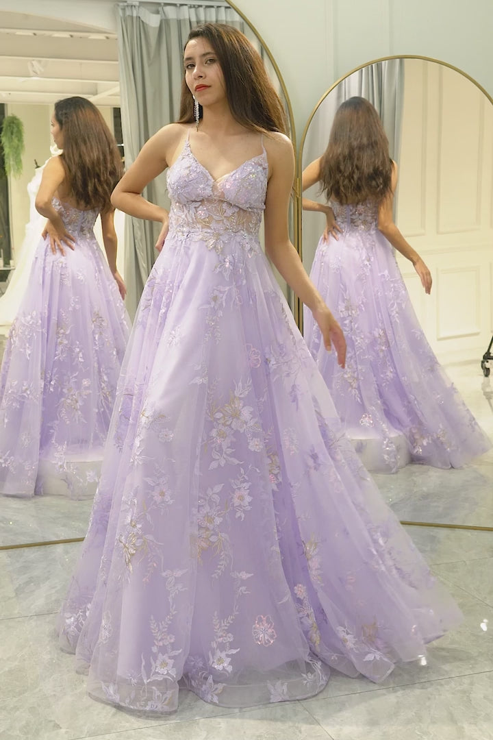 Robe de Soirée violette à paillettes trapèze avec broderie