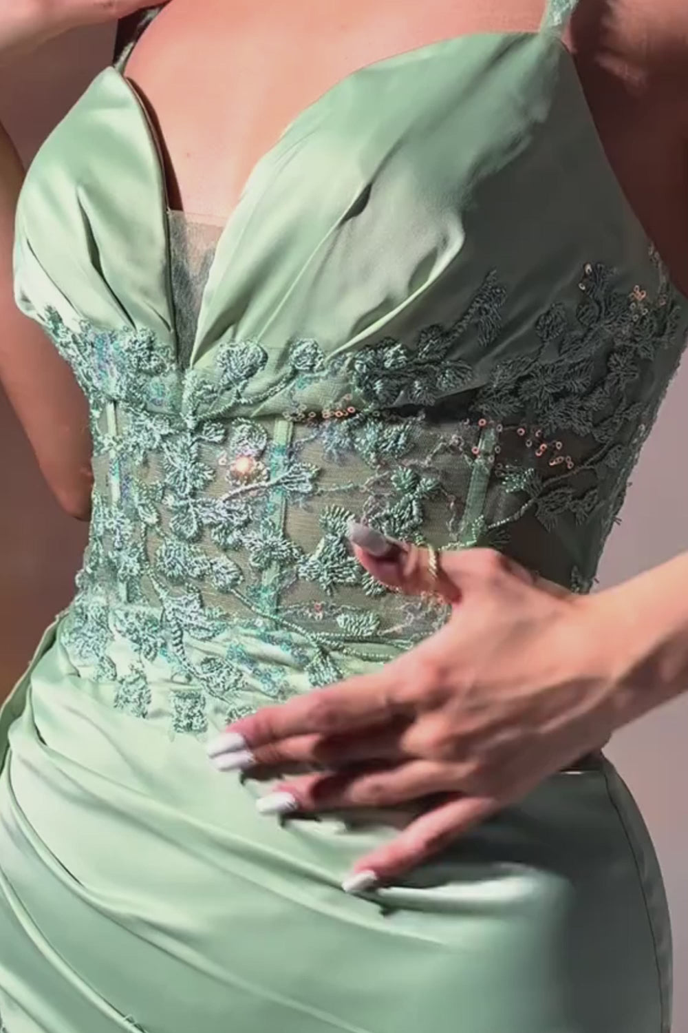 Robe de soirée longue sirène vert clair scintillante à bretelles spaghetti et appliques avec fente